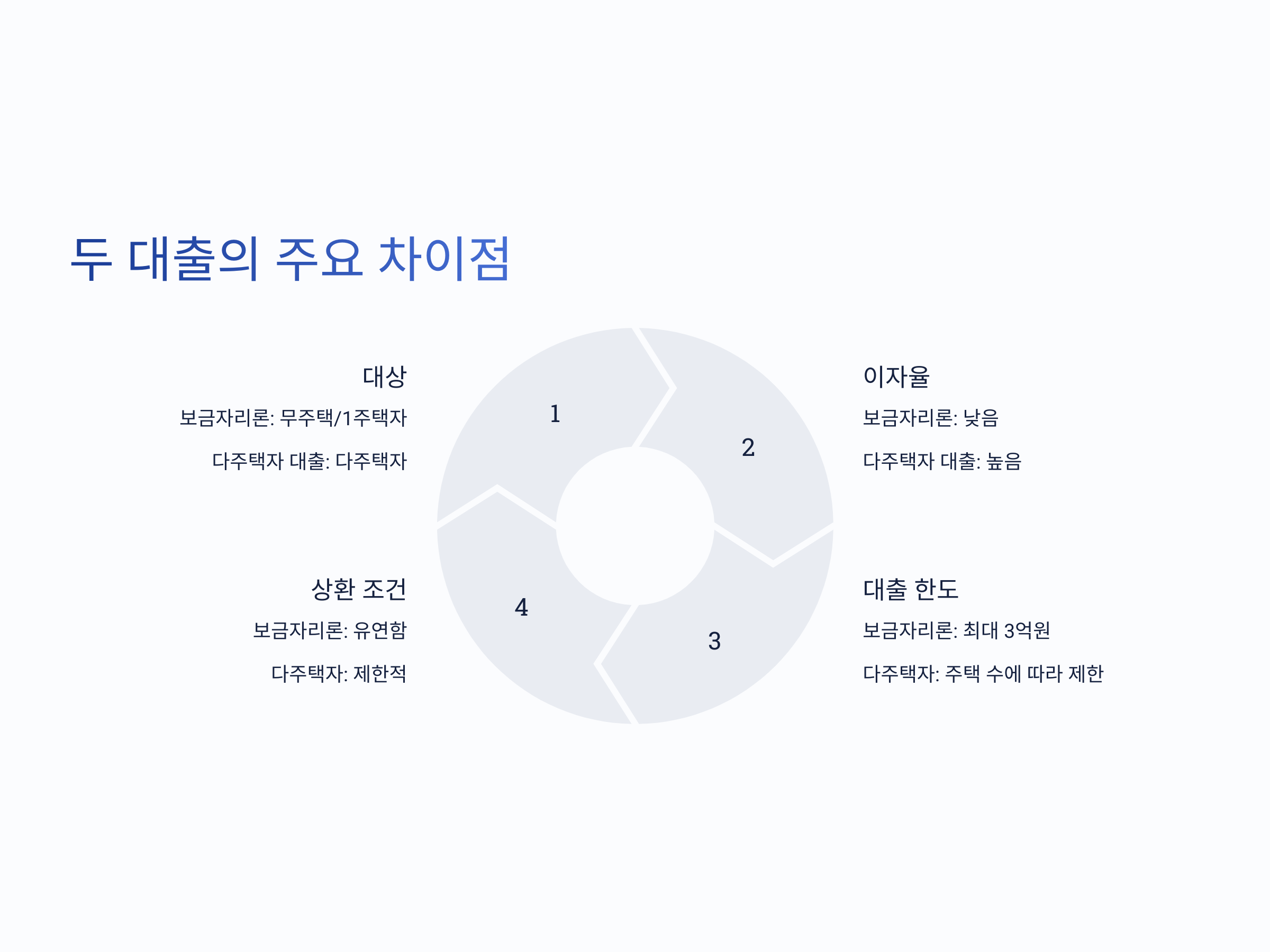 - 상환 조건: 보금자리론은 상환 기간이 유연하지만, 다주택자 대출은 상환 기간이나 조건이 더 제한적일 수 있습니다.