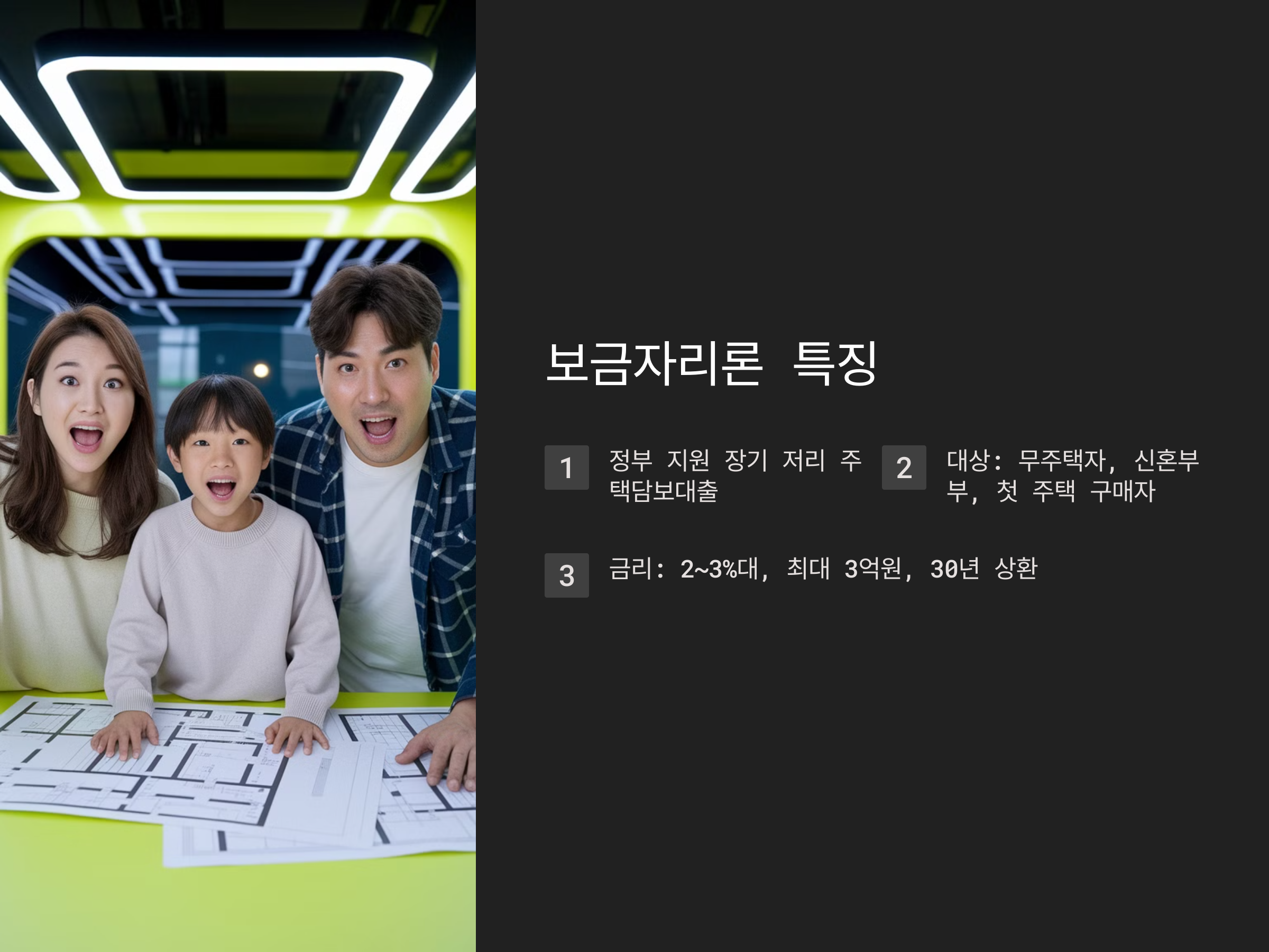 보금자리론은 주로 무주택자, 생애 첫 주택 구매자를 대상으로 하며, 소득 제한과 가구 구성원 등의 조건을 충족해야 합니다. 신청 전, 자격 요건을 꼼꼼히 확인하는 것이 중요합니다.