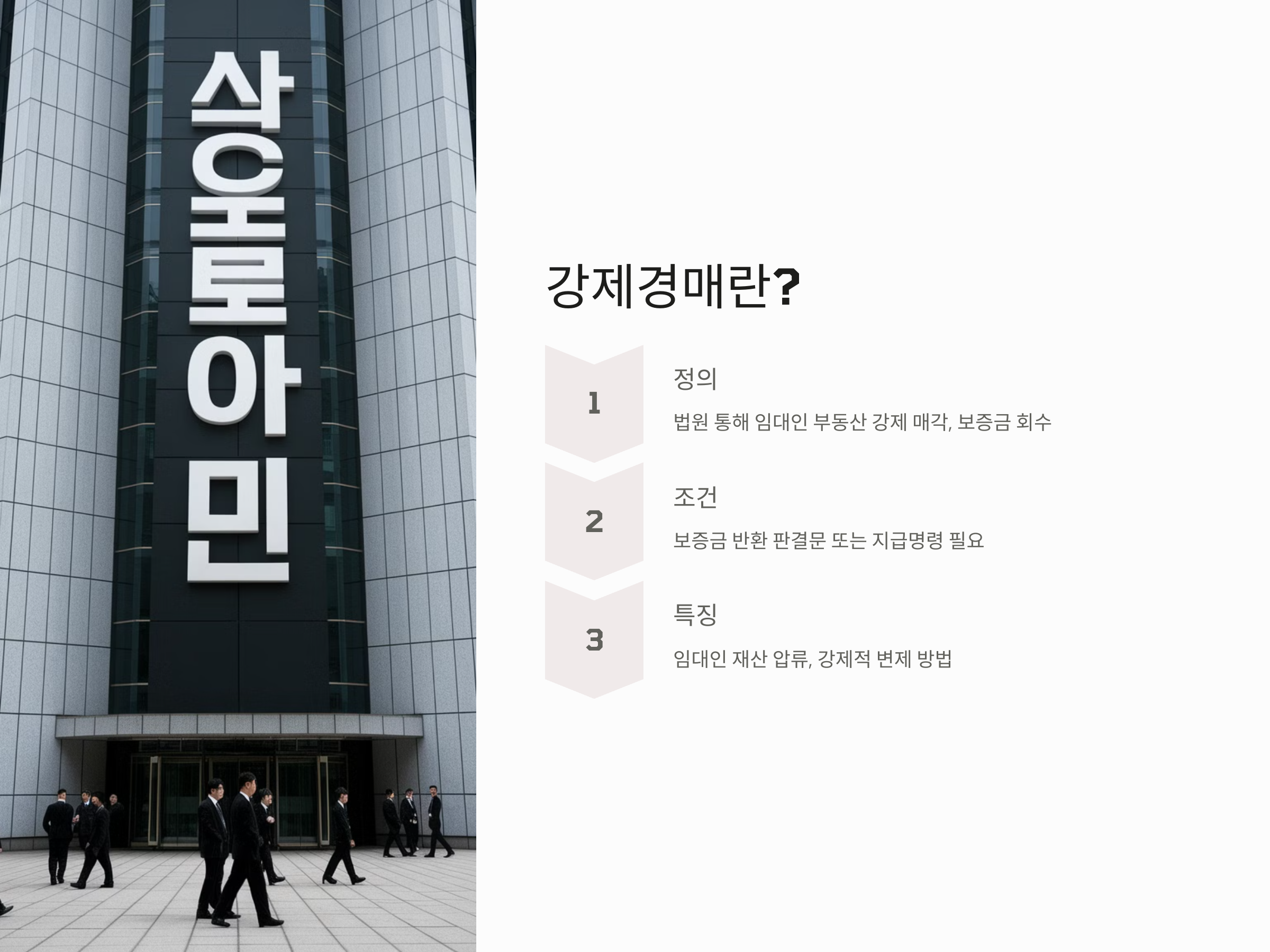 강제경매는 임대인이 보증금을 반환하지 않을 때, 법원을 통해 임대인의 부동산을 강제로 매각하여 보증금을 돌려받는 절차입니다. 이는 보증금 반환 소송과 다르게 임대인의 재산을 압류하여 강제적으로 변제받는 방법입니다.