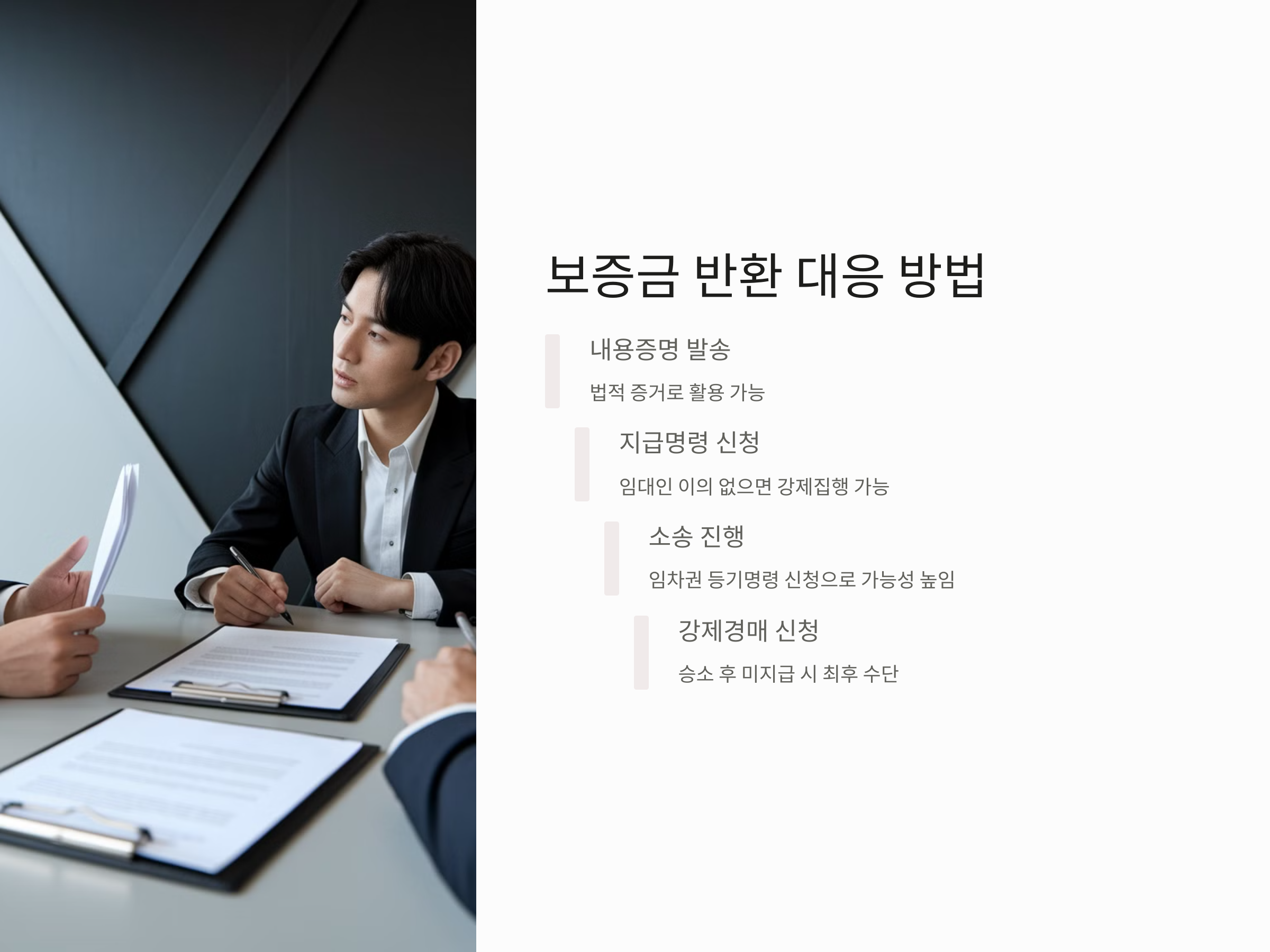 - 법적 절차를 통해 임대인이 보증금을 지급하지 않으면 강제집행(예: 강제경매)으로 넘어갈 수 있습니다.