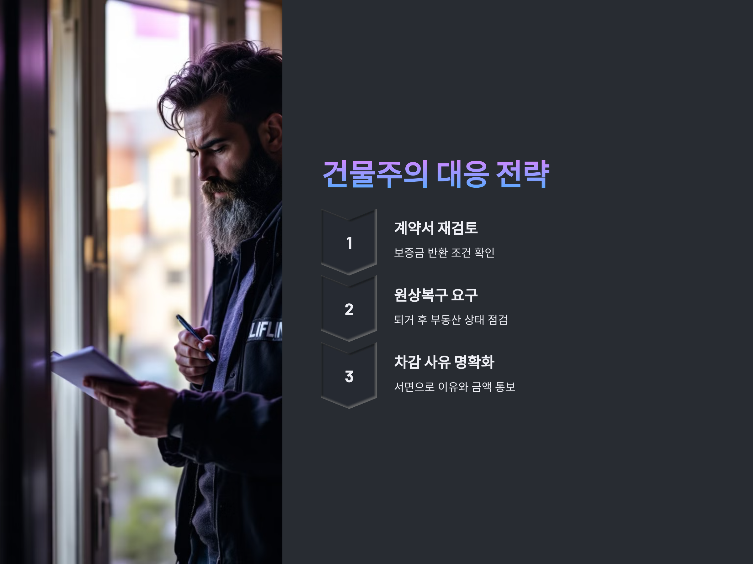 건물주는 임차인이 퇴거한 후, 해당 부동산의 원상복구 여부를 점검해야 합니다. 원상복구가 이루어지지 않았거나, 임차인이 물건을 훼손했다면, 이를 이유로 보증금에서 일부를 차감할 수 있습니다. 하지만 원상복구를 요구하기 전에는 반드시 이를 계약서에 명시해야 하며, 임차인에게 사전 통보를 해야 합니다.