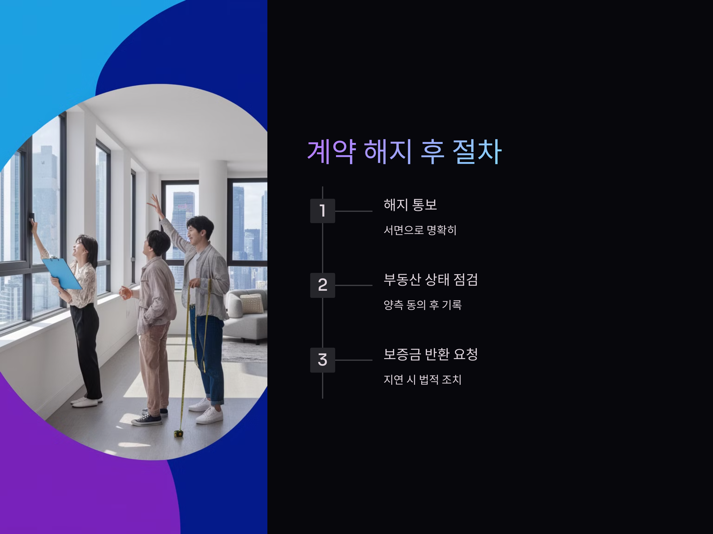 계약 해지는 보증금 반환뿐만 아니라, 임대인과 임차인 간에 각종 법적 절차가 필요한 상황입니다. 특히 계약 해지 후의 절차는 법적 분쟁을 예방하기 위해 반드시 따라야 하는 과정이 있습니다.