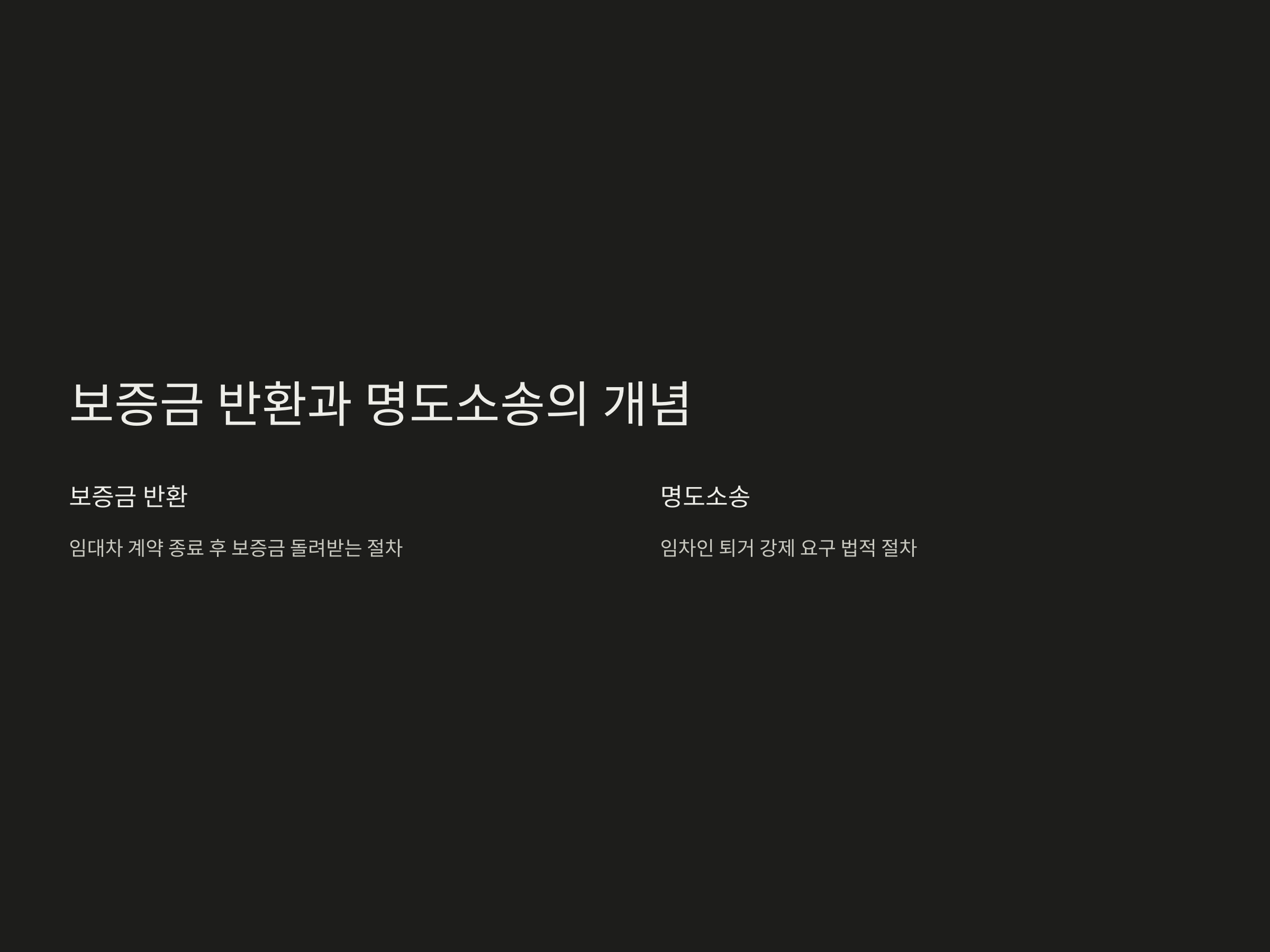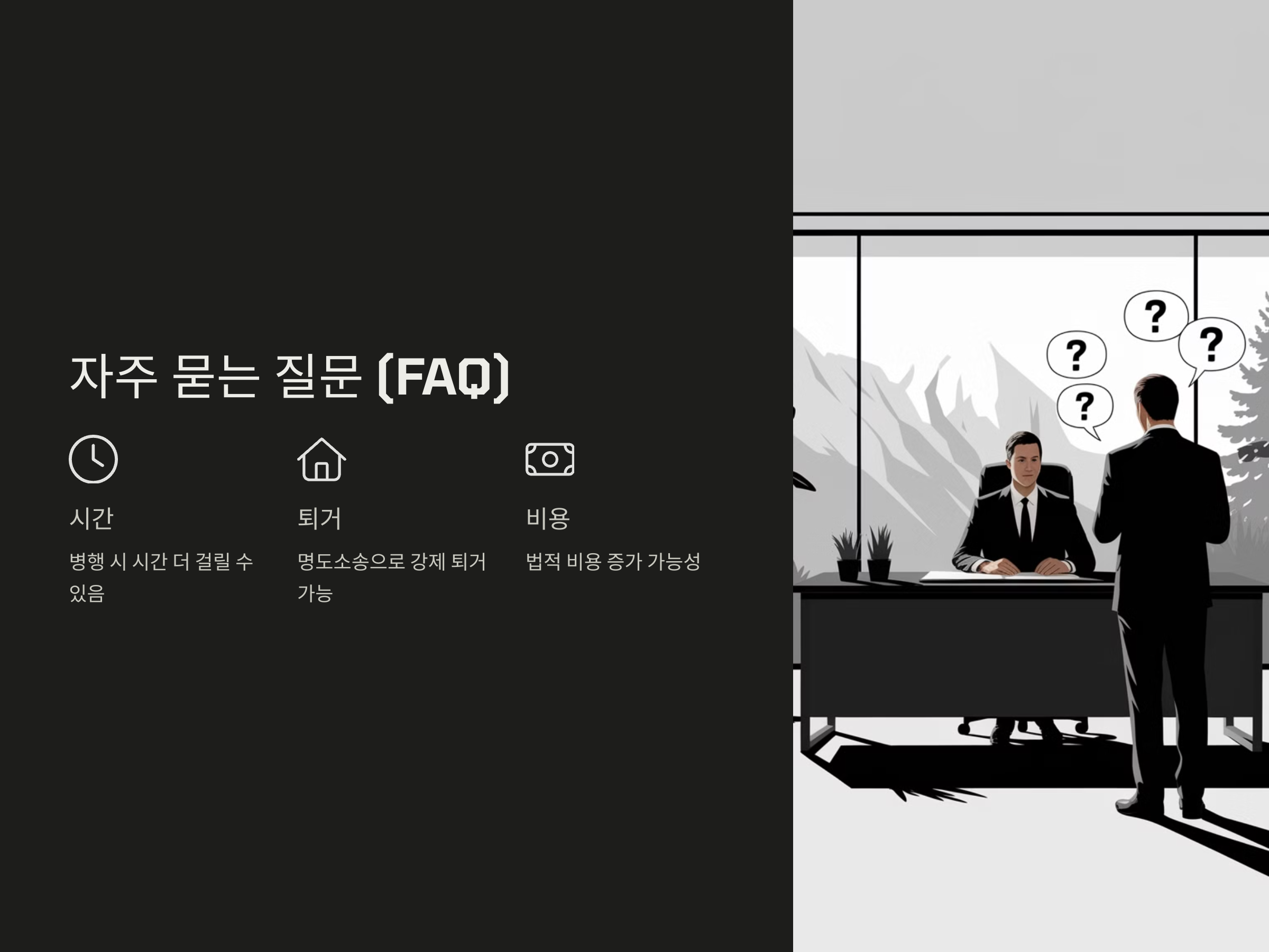 - 임차인의 퇴거 지연: 임차인이 퇴거를 거부하는 경우, 명도소송을 통해 강제 퇴거를 시킬 수 있으며, 그와 함께 보증금 반환에 대한 소송도 진행할 수 있습니다.