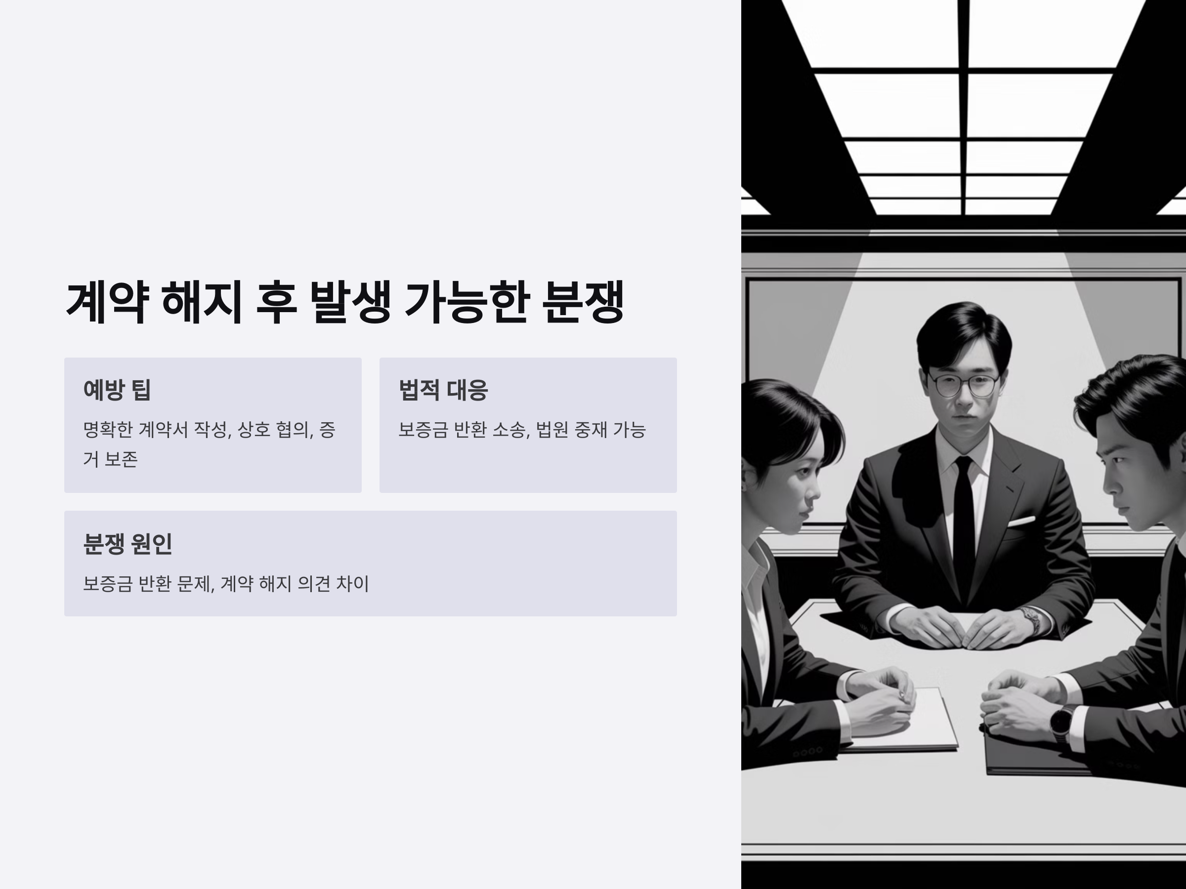 임대차 계약 해지 후에는 여러 가지 법적 분쟁이 발생할 수 있습니다. 보증금 반환 문제 외에도 계약 해지 자체에 대해 양측의 의견이 다를 수 있기 때문에 분쟁이 생기지 않도록 예방하는 것이 중요합니다.