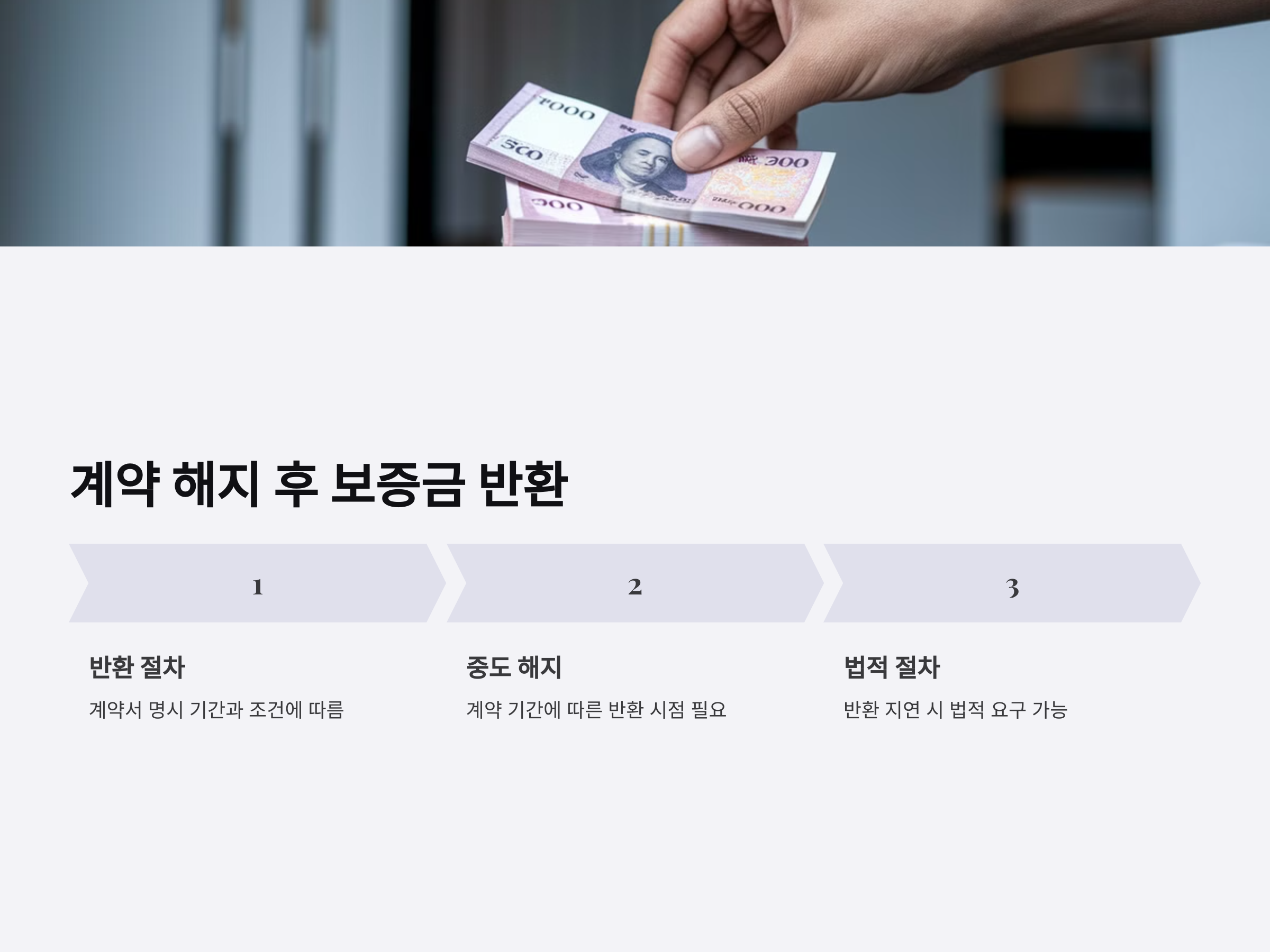 임대차 계약 해지 시, 보증금 반환은 계약서에 따른 기간과 조건에 따라 이루어집니다. 보통 계약이 종료되면 보증금 반환 절차가 시작되지만, 임대차 계약 해지 시 보증금을 반환받지 못할 수도 있습니다. 이때 임차인이 계약 해지 후 보증금을 받기 위해서는 법적인 절차를 통해 반환을 요구할 수 있습니다.