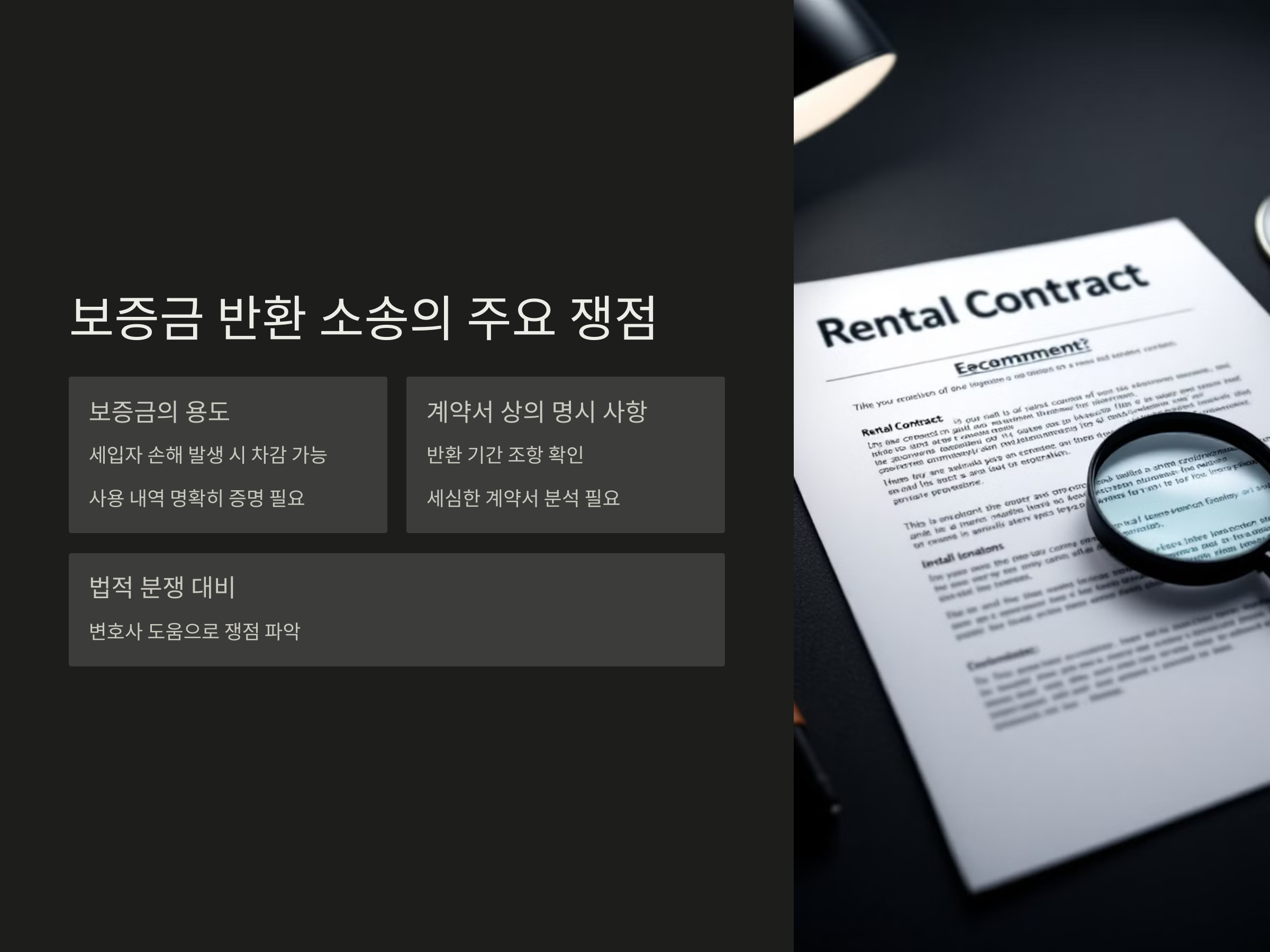 보증금 반환 소송에서 중요한 쟁점은 바로 보증금의 사용 목적과 계약서의 조건입니다. 이 두 가지가 법적 판단에 중요한 영향을 미치기 때문에, 이를 명확히 이해하는 것이 필요합니다.