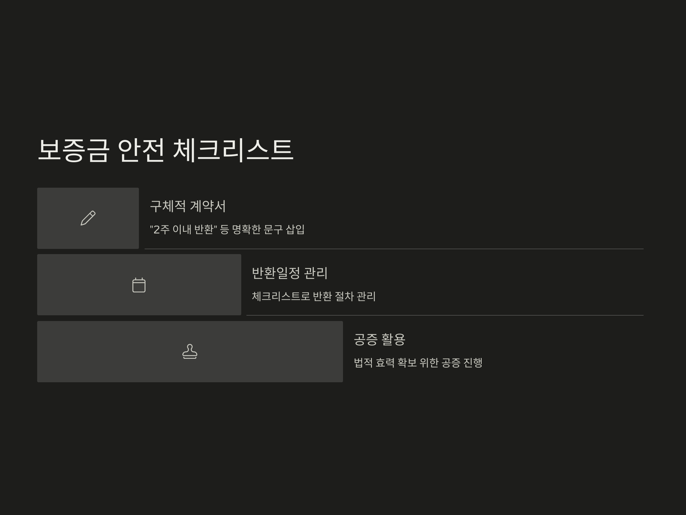 보증금 반환 문제를 사전에 예방하기 위해 가장 중요한 것은 ‘계약서 작성’입니다. 계약서에 반환 조건, 반환 시기, 지연 시 손해배상 규정 등을 명확히 기재해 두면 분쟁 발생 시 유리한 증거가 됩니다. 특히 계약서에 ‘계약 종료일 기준 2주 이내 반환’과 같은 구체적인 문구를 삽입하면 분쟁을 최소화할 수 있습니다.