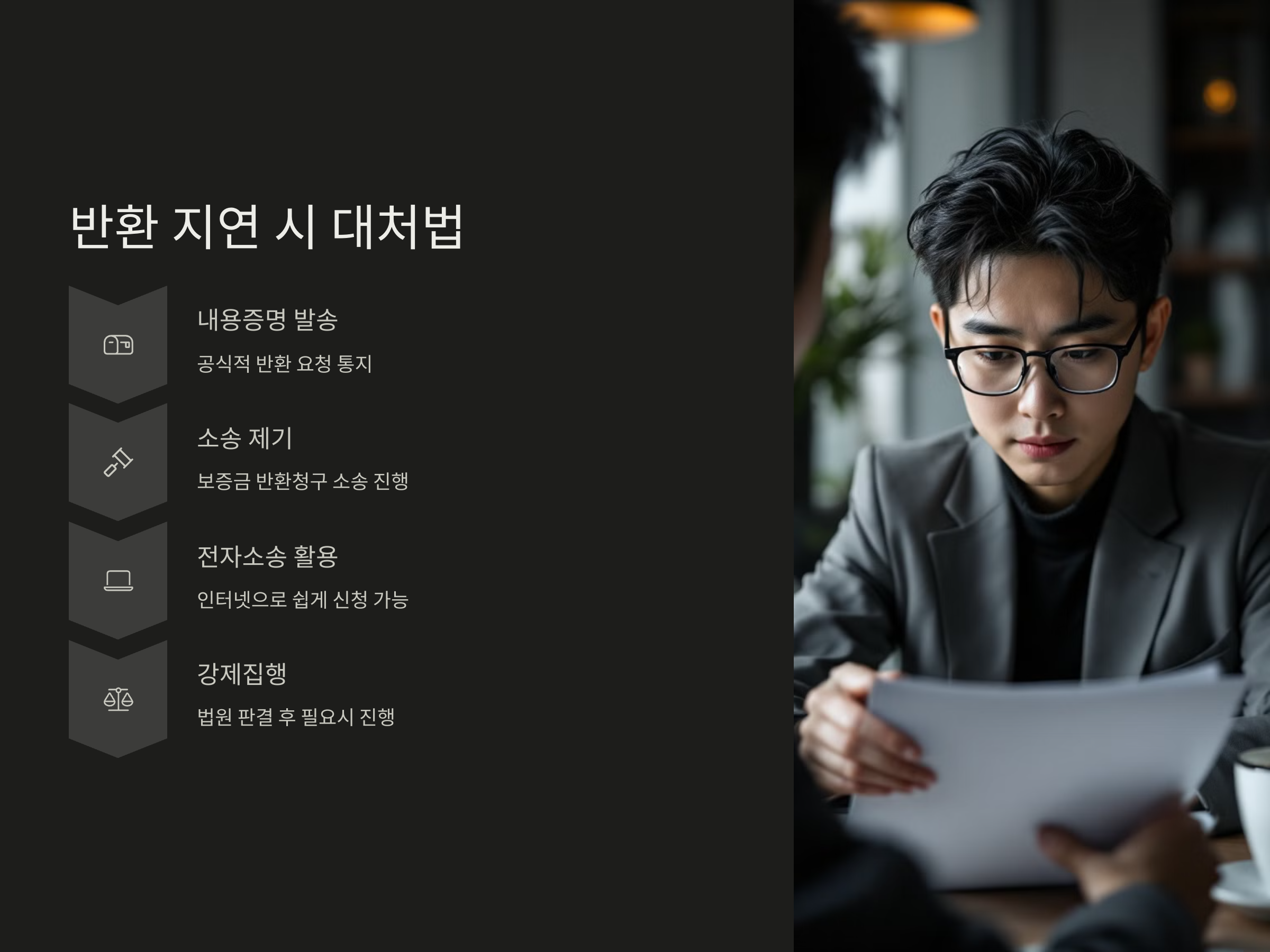 보증금 반환이 지연될 경우 당황하지 말고 다음과 같은 절차를 밟는 것이 중요합니다. 우선, 계약 종료일로부터 일정 기간이 지나도 반환이 되지 않았다면, 내용증명을 통해 반환 요청을 공식적으로 통지해야 합니다. 이는 추후 소송을 위한 증거 자료로도 사용될 수 있습니다.