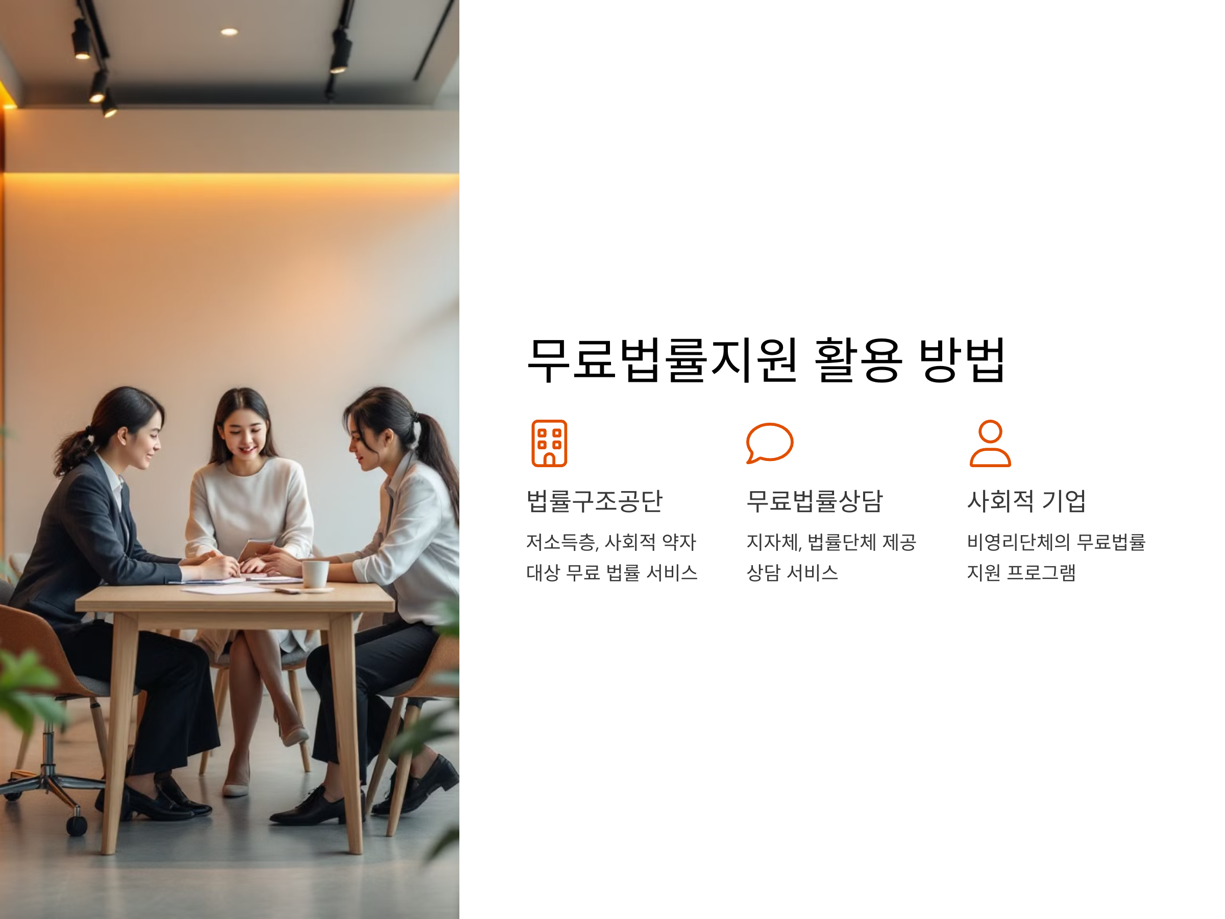 - 사회적 기업 및 비영리 단체: 일부 사회적 기업이나 비영리 단체에서도 무료법률지원 프로그램을 제공하는 경우가 있습니다. 이들 단체는 소송 지원뿐만 아니라, 법률적 조언도 제공해 줍니다.
