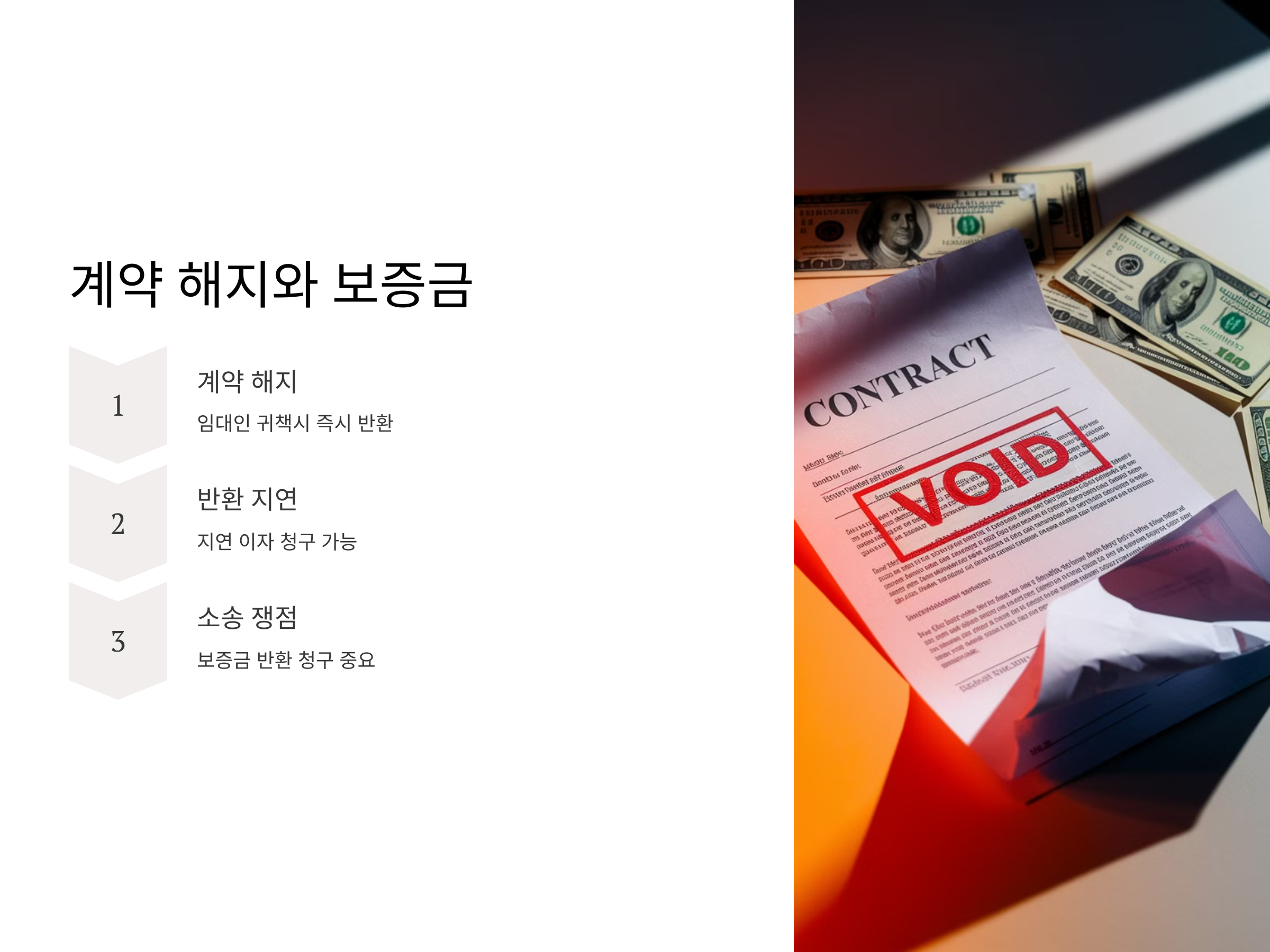임대차계약이 해지된 경우, 임대인은 임차인에게 보증금을 반환할 의무가 있습니다. 특히, 임대인의 귀책사유로 계약이 해지된 경우에는 임대인은 지체 없이 보증금을 반환해야 합니다. 만약 임대인이 보증금 반환을 지연할 경우, 임차인은 지연 이자를 청구할 수 있으며, 이는 임대차보증금 반환 청구 소송에서 중요한 쟁점이 될 수 있습니다.
