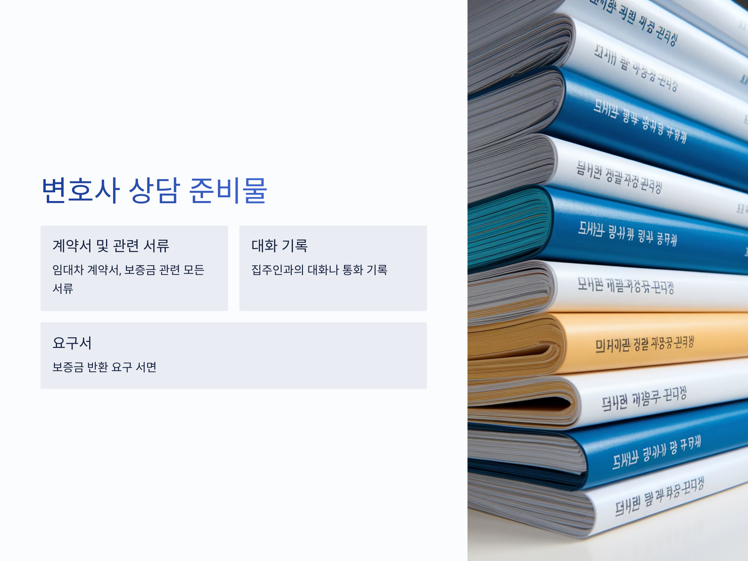 임대차 계약서와 보증금 반환과 관련된 모든 서류를 준비해야 합니다. 이를 통해 변호사는 사건의 내용을 파악하고, 적절한 법적 조치를 취할 수 있습니다.
