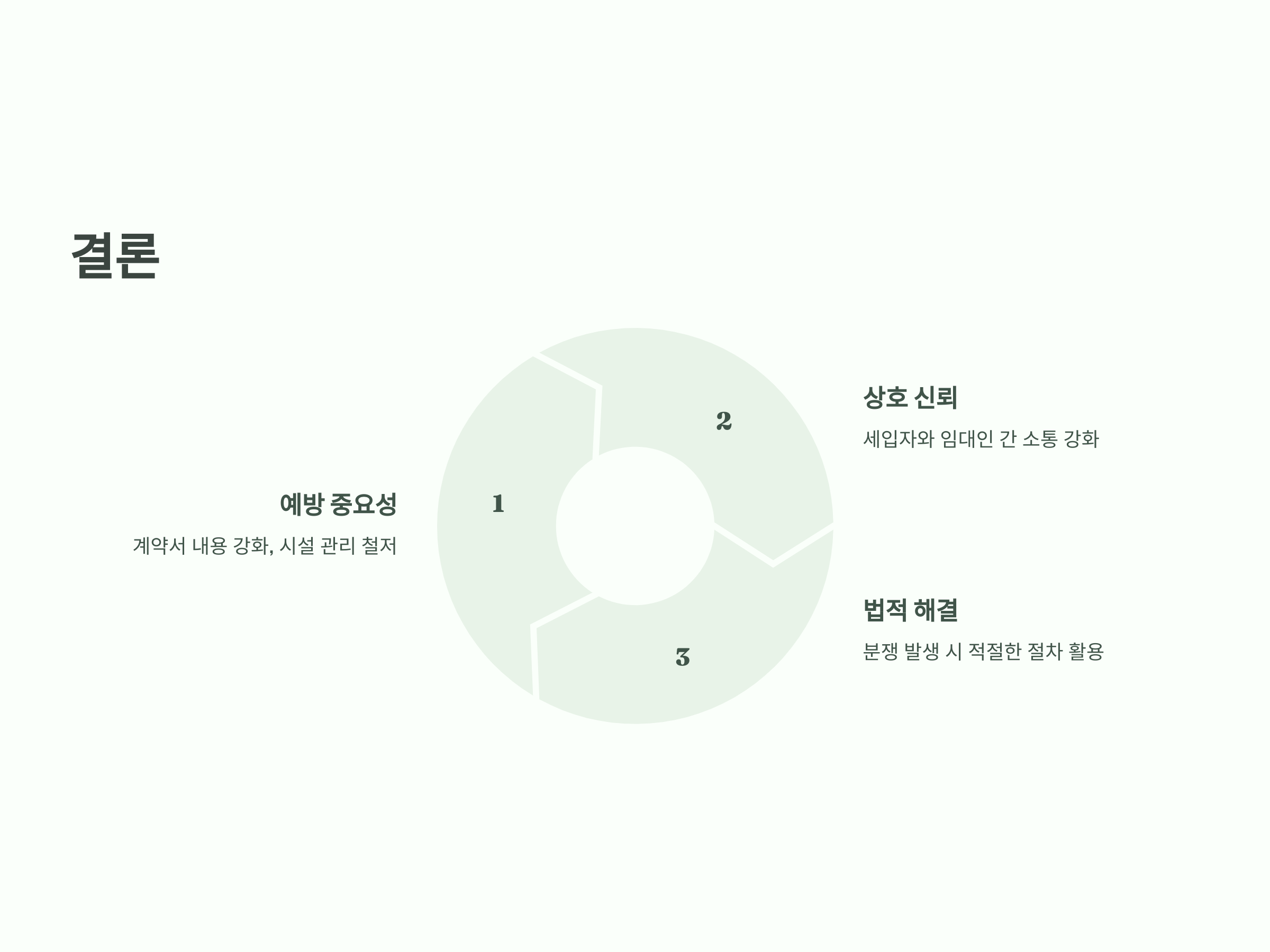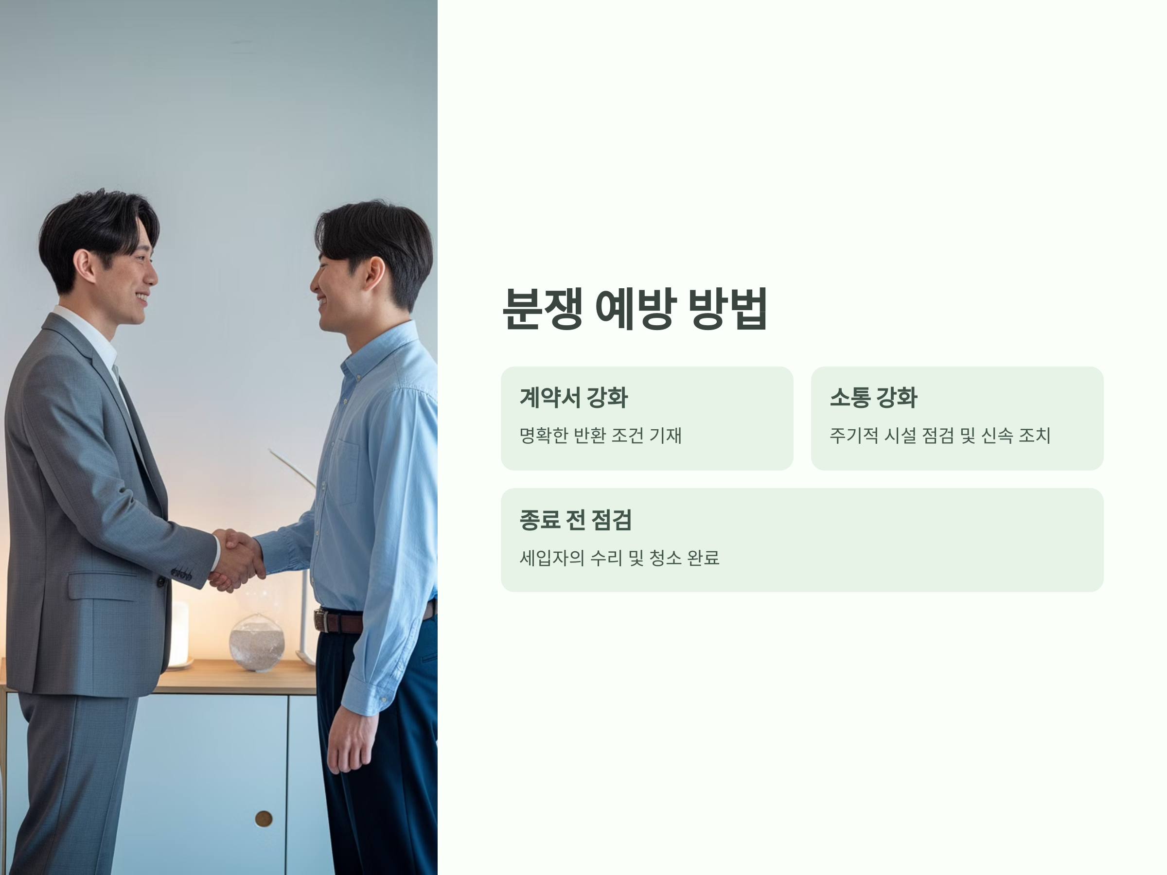 임대인은 세입자와의 소통을 통해 시설의 상태를 주기적으로 점검하고, 문제 발생 시 신속하게 조치를 취하는 것이 중요합니다. 세입자도 계약 종료 전, 시설의 상태를 점검하고 필요한 수리나 청소를 마친 후 계약을 종료해야 합니다.