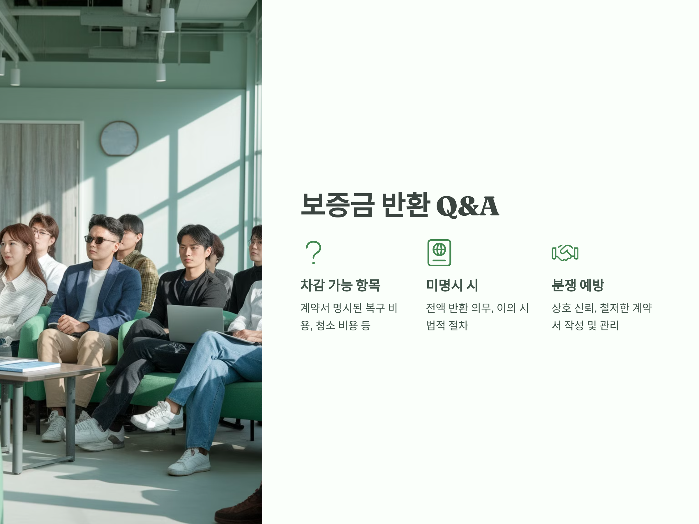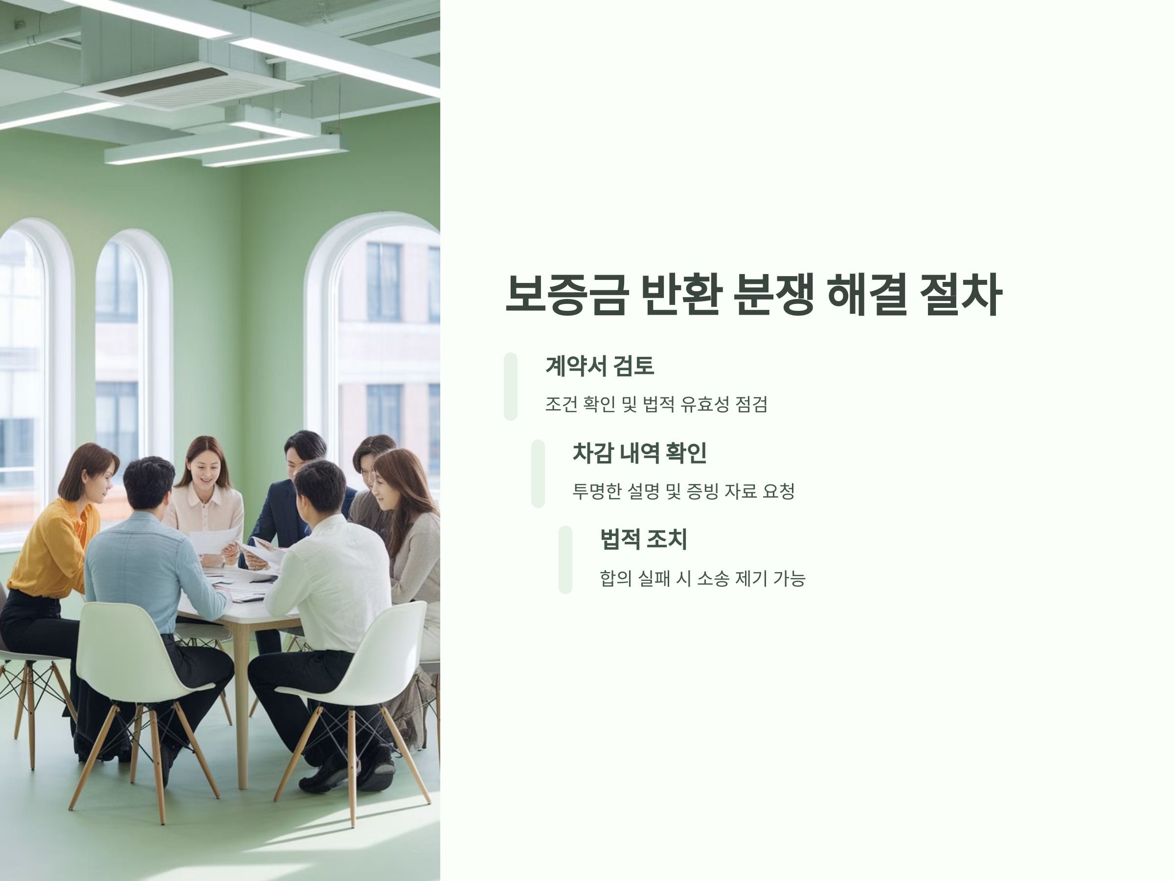 보증금 반환과 관련된 분쟁은 많은 세입자와 임대인 간에 발생할 수 있는 문제입니다. 그러나 보증금 반환 절차와 차감 항목을 미리 명확히 하고, 계약서에 이를 반영하는 것만으로도 분쟁을 예방할 수 있습니다. 실무적인 사례를 통해 보증금 반환과 관련된 법적 쟁점과 분쟁 해결 방법을 충분히 이해하고, 이를 예방하기 위한 노력이 필요합니다.