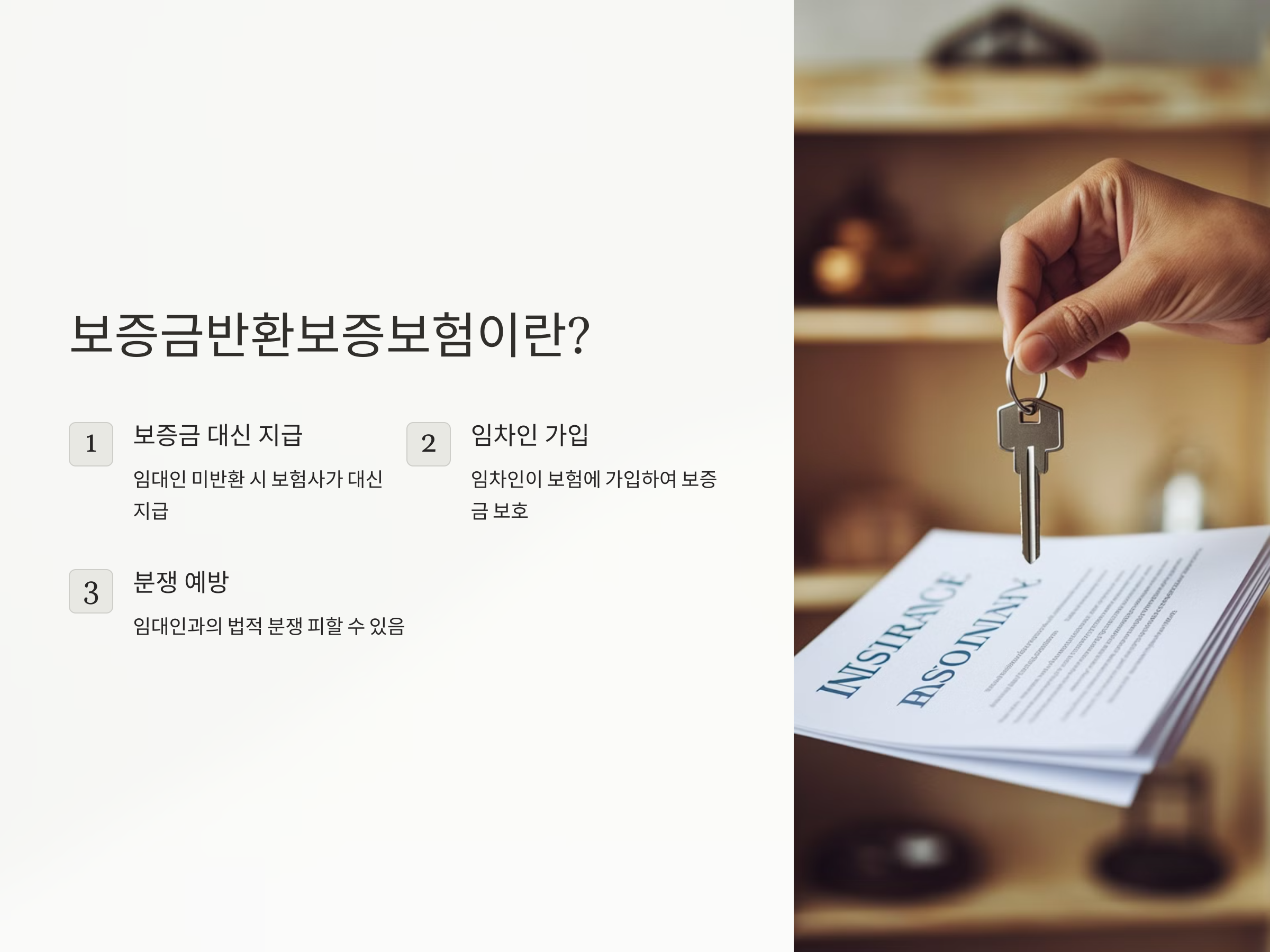 보증금반환보증보험의 핵심은 무엇인가요? 보증금반환보증보험은 임대차 계약이 끝난 후 임대인이 보증금을 반환하지 않을 경우, 보험회사가 보증금을 대신 지급해주는 방식입니다. 이 보험은 계약 당시 임차인과 임대인 간에 발생할 수 있는 분쟁을 예방하고, 보증금 반환을 원활하게 하는 중요한 역할을 합니다. 임차인 입장에서는 불안한 보증금 반환 문제를 해결할 수 있는 유용한 수단이 됩니다.