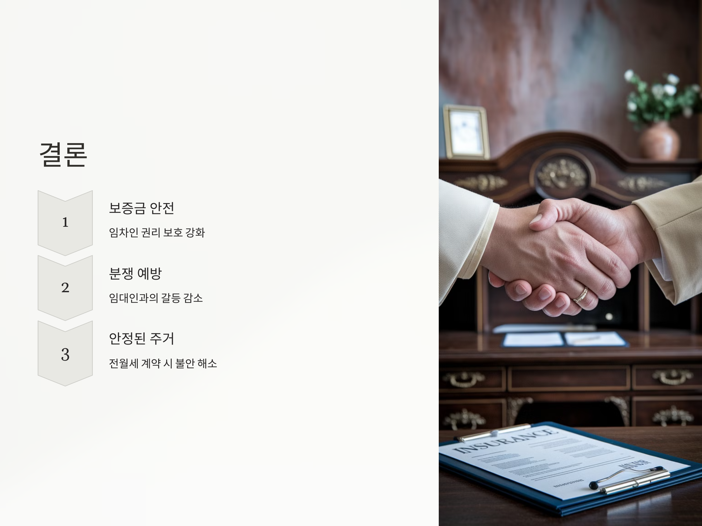 - 간편한 처리: 보험을 통해 직접 보증금을 받을 수 있어, 임대인과의 협상이나 법적 절차를 거칠 필요가 없습니다.