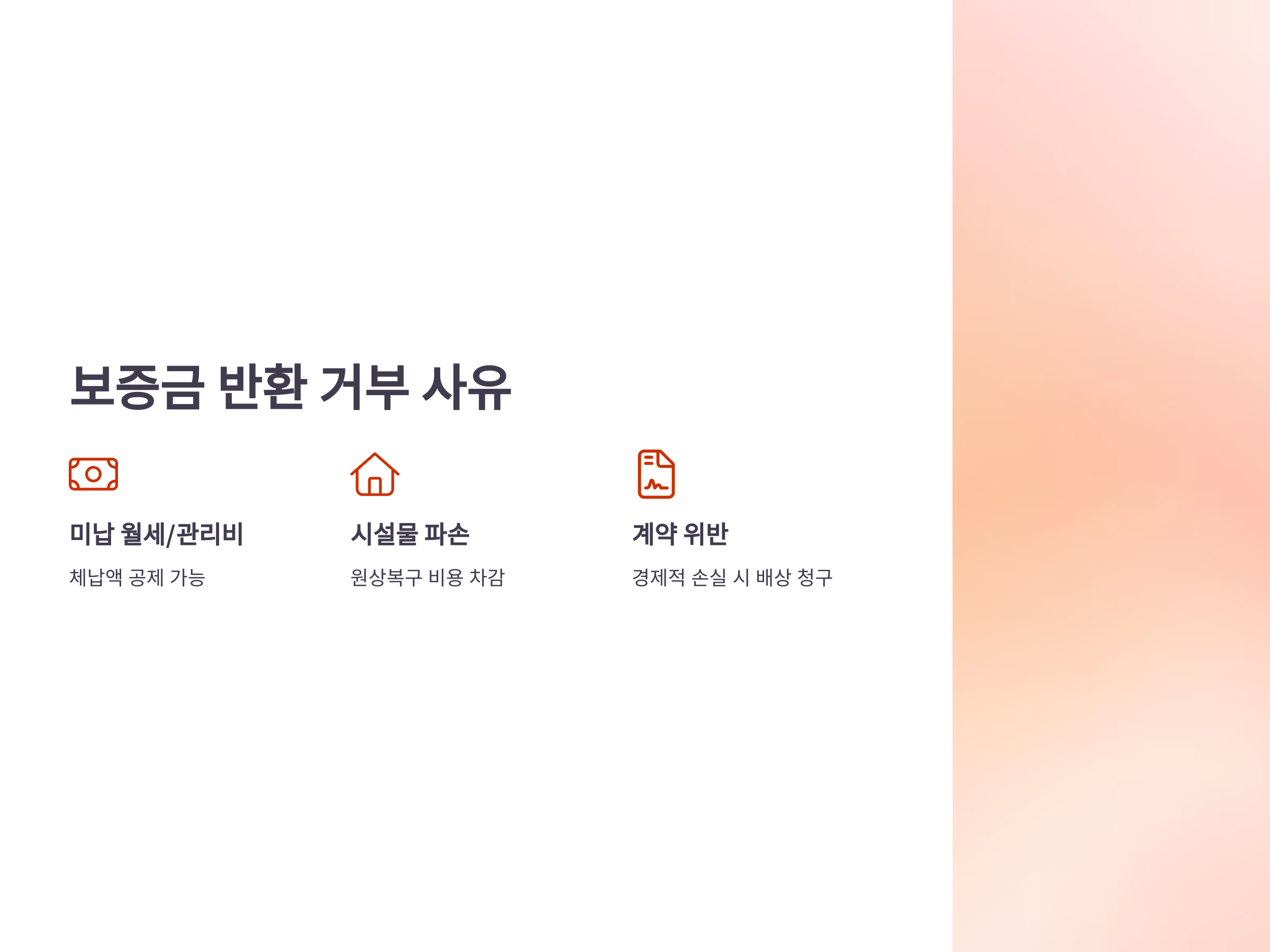 임대인은 특정한 사유가 있을 때 보증금 반환을 거부하거나 일부를 공제할 수 있습니다. 대표적인 사례는 다음과 같습니다.