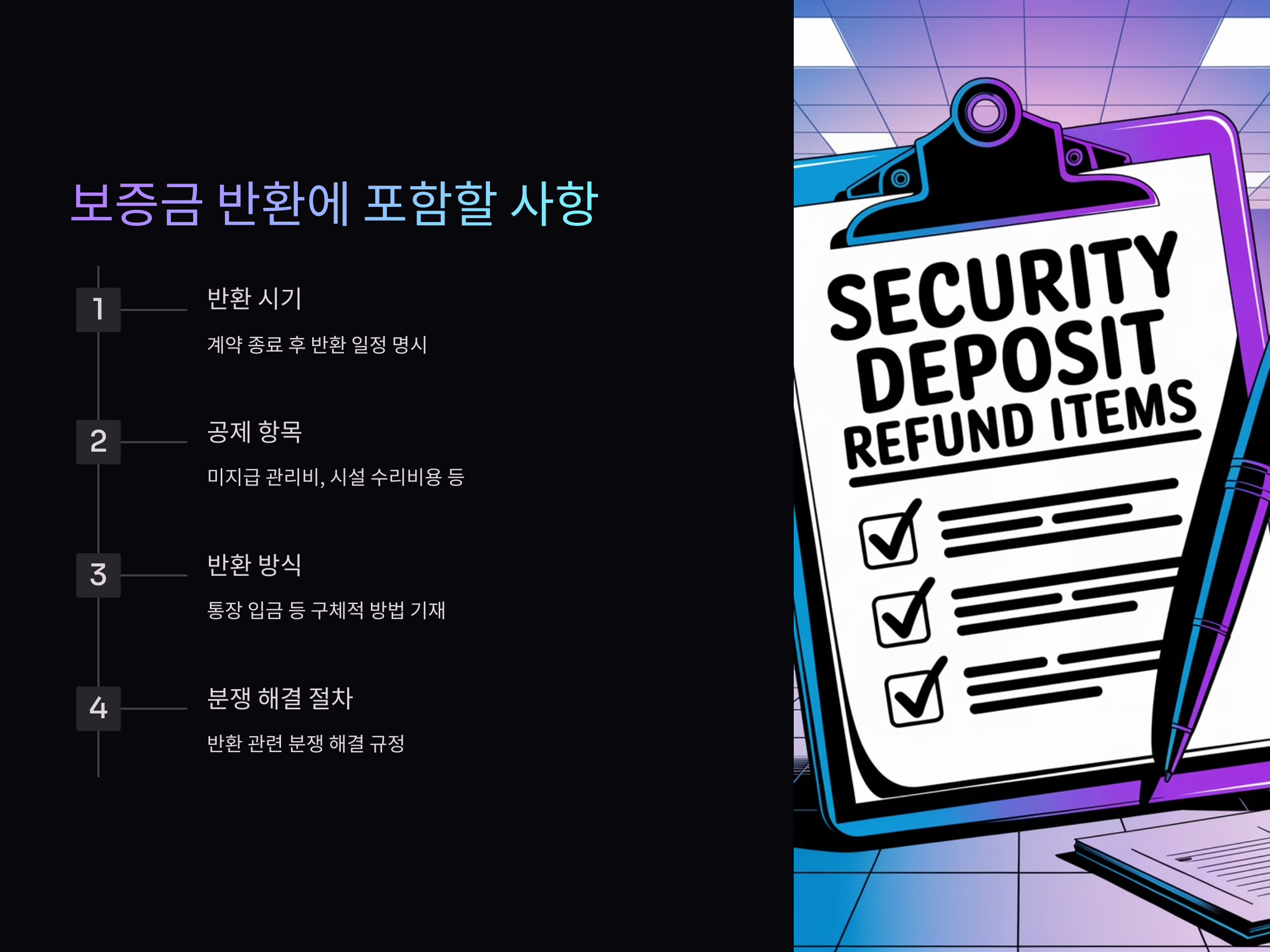 계약서의 모든 조항은 양측의 합의 하에 작성되어야 하며, 후에 분쟁이 발생하지 않도록 모두 명확히 규정해야 합니다. 특히 보증금 반환과 관련된 모든 사항을 세밀하게 기록하는 것이 중요합니다.