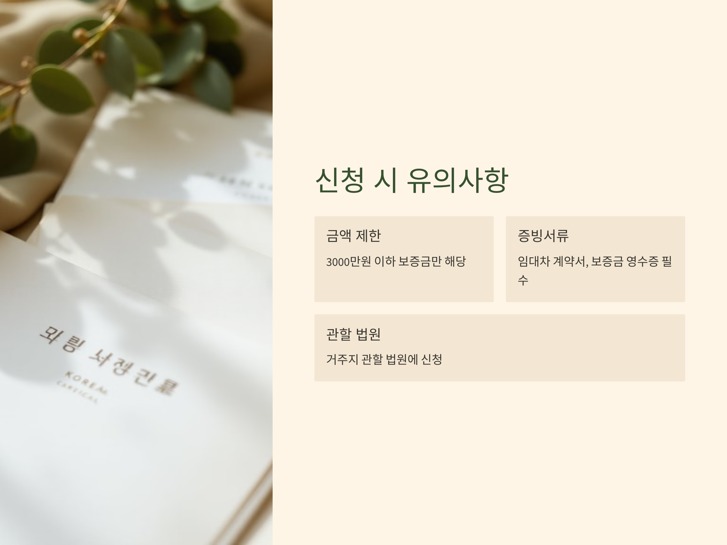 보증금 반환 지급명령 신청 시 유의해야 할 몇 가지 사항이 있습니다. 첫 번째는 신청할 수 있는 보증금의 액수가 일정액 이하일 때만 해당 절차를 사용할 수 있다는 점입니다. 보통 이 금액은 3000만 원 이하로 규정되어 있으며, 그 이상의 금액은 일반적인 민사소송을 통해 해결해야 합니다.
