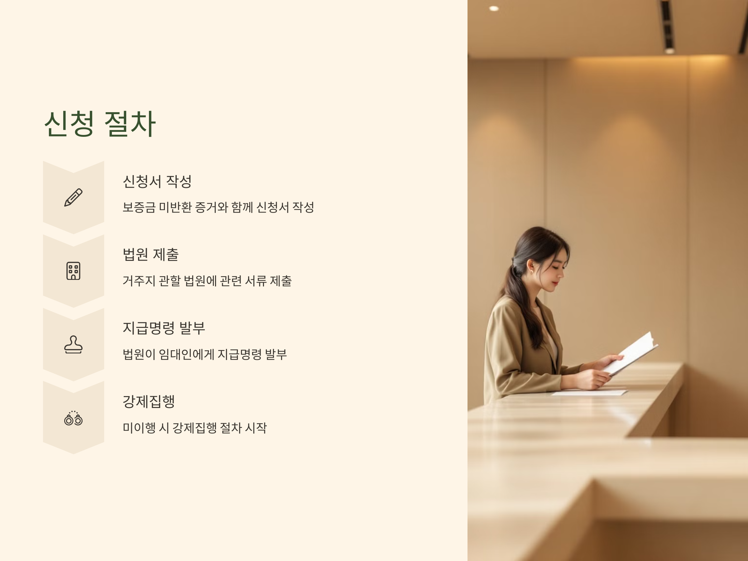 첫 번째로, 임차인은 보증금을 반환받지 못했다는 증거와 함께 지급명령 신청서를 작성하여 법원에 제출합니다. 그 후, 법원은 신청서를 검토하고 임대인에게 지급명령을 내립니다. 만약 임대인이 명령을 따르지 않으면, 강제집행 절차가 시작될 수 있습니다. 이 과정은 민사소송보다는 간단하고 비용이 적게 드는 장점이 있습니다.