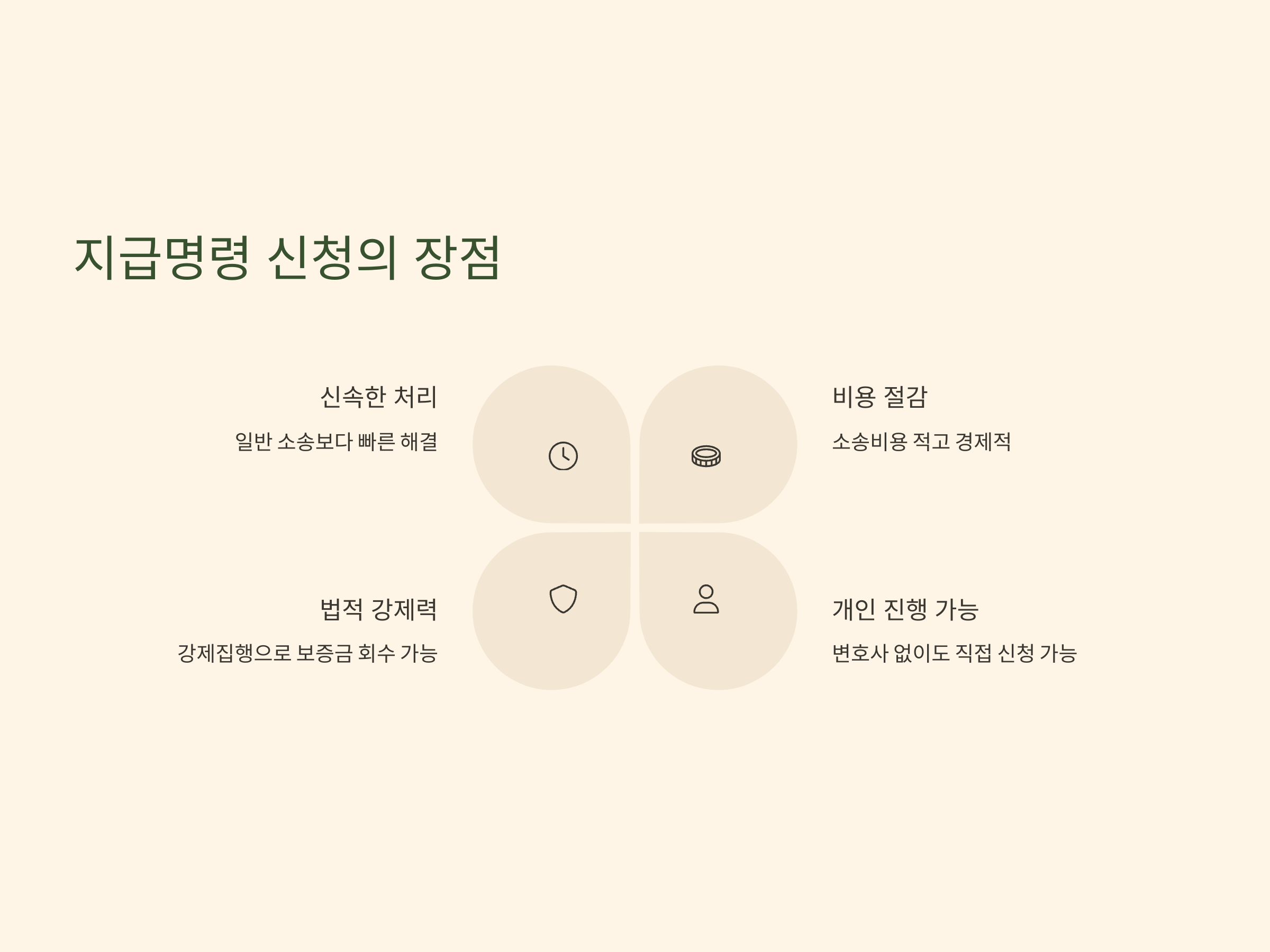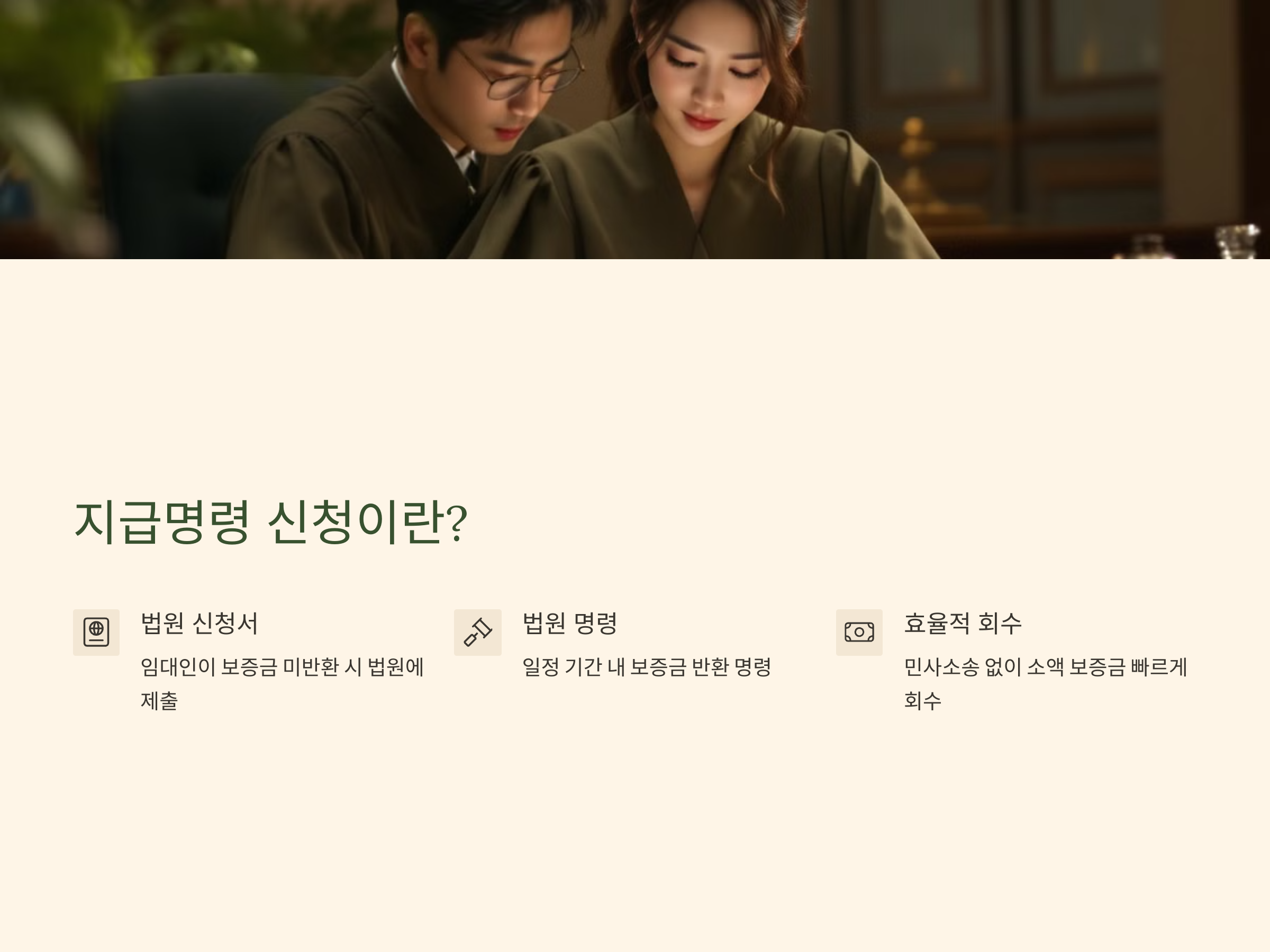 보증금 반환 지급명령 신청의 가장 큰 장점은 소송비용이 적고, 빠른 시간 내에 해결할 수 있다는 점입니다. 일반적인 민사소송은 시간이 오래 걸리고, 법적 비용이 많이 드는 경우가 많습니다. 하지만 지급명령은 상대방이 이를 따르지 않을 경우에도 빠르게 강제집행을 통해 보증금을 회수할 수 있어 임차인에게 매우 유리한 절차입니다.