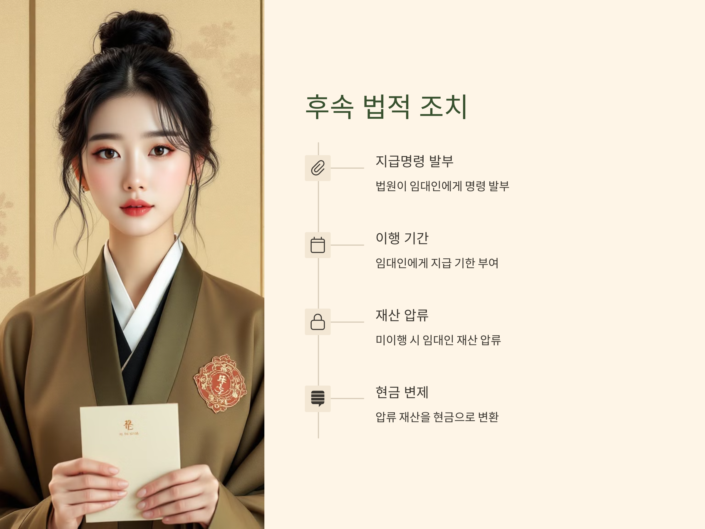 보증금 반환 지급명령은 후속적인 법적 절차로 이어질 수 있습니다. 만약 임대인이 지급명령에 따라 보증금을 지급하지 않으면, 임차인은 강제집행을 통해 보증금을 돌려받을 수 있습니다. 강제집행은 법원이 임대인의 재산을 압류하거나 현금으로 변제하도록 하는 절차로, 이 과정은 법적 강제력을 동반하기 때문에 보증금이 반환될 가능성이 매우 높습니다.