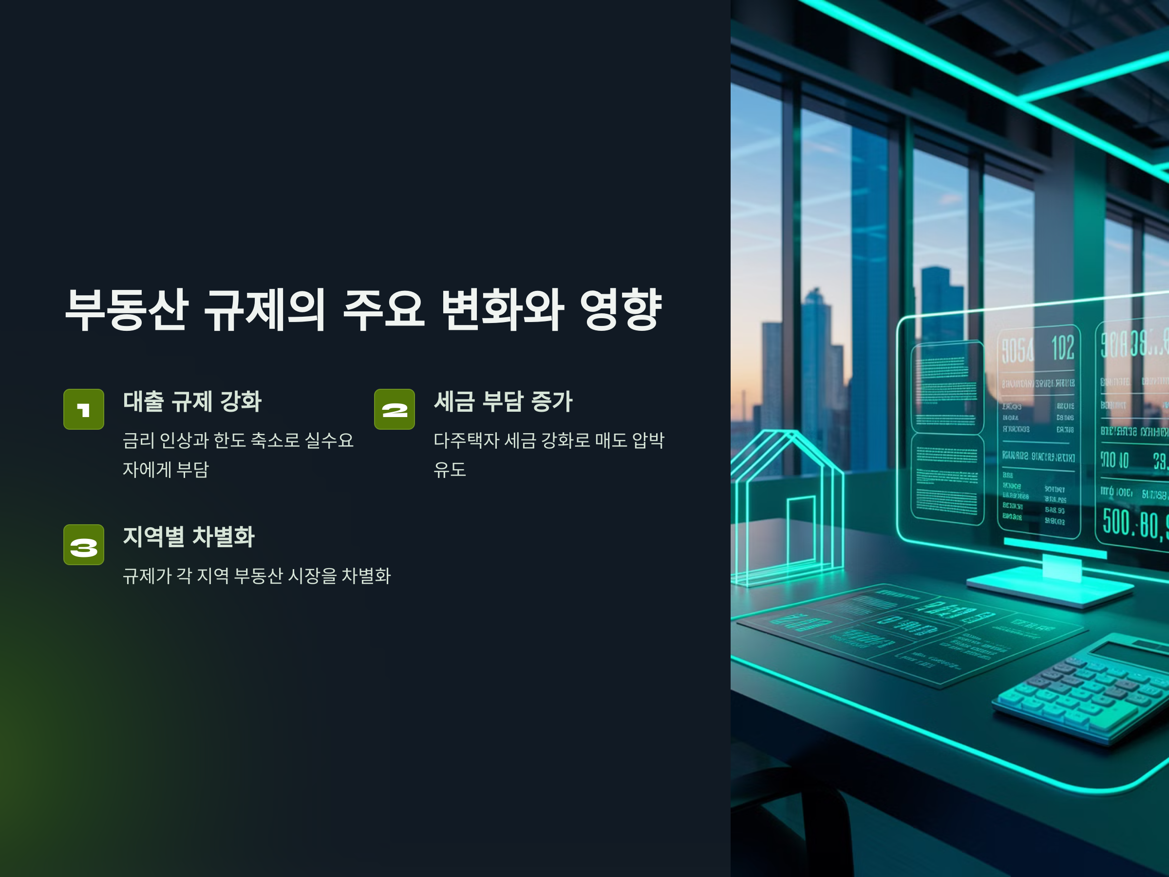 부동산 시장에서 가장 큰 변화는 정부의 규제 강화입니다. 특히, 실수요자와 투기세력을 구분하기 위한 정책이 주목받고 있습니다. 최근에는 대출 규제, 세금 부담, 공급 제한 등이 주요한 변화 요소로 떠오르고 있습니다. 이러한 규제의 변화는 각 지역의 부동산 시장을 차별화시키고, 특정 지역의 가격 상승을 제한하는 데 큰 역할을 하고 있습니다.
