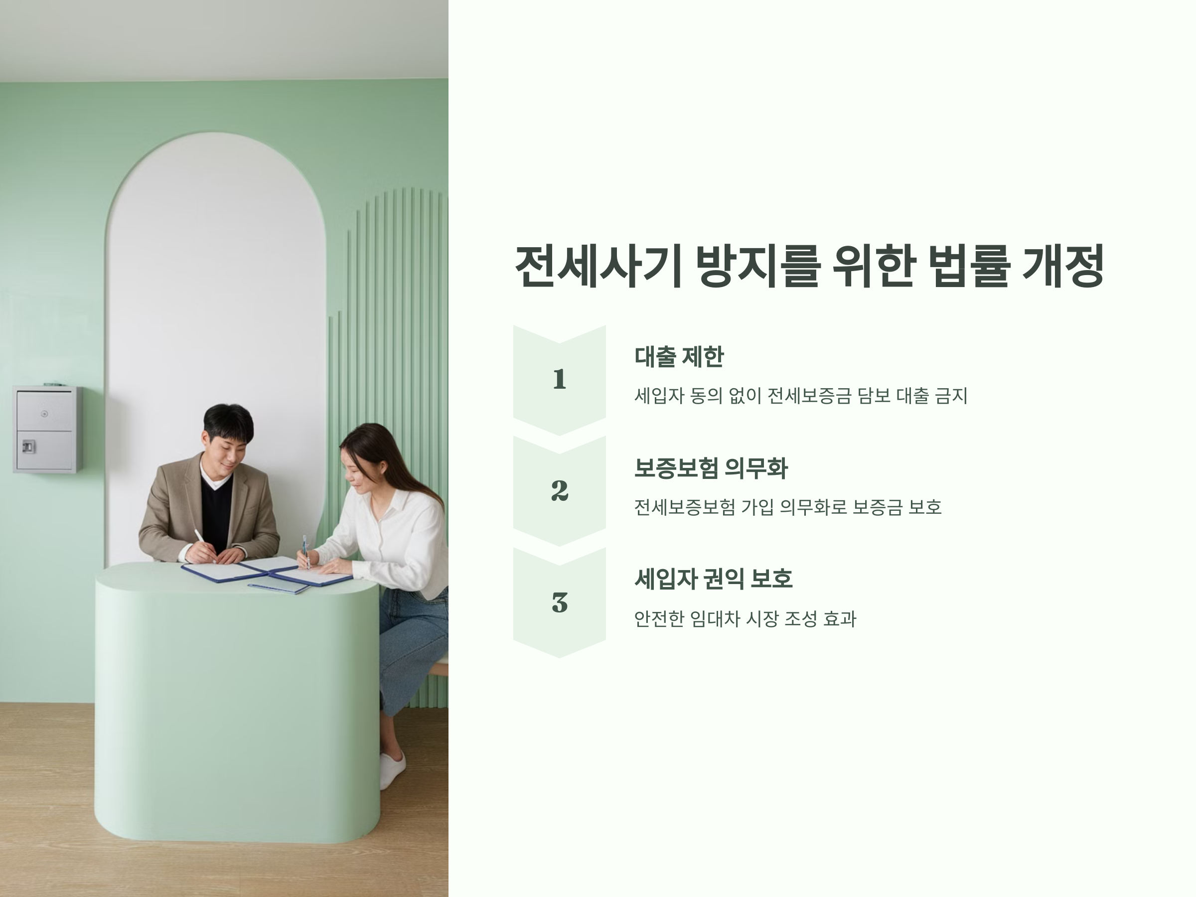 전세사기를 방지하기 위해 임대인이 세입자의 동의 없이 전세보증금을 담보로 대출받을 수 없도록 하는 법률이 시행되었습니다. 또한, 전세보증보험 가입이 의무화되어 세입자의 보증금 보호가 강화되었습니다. 이러한 조치는 세입자의 권익을 보호하고, 안전한 임대차 시장을 조성하기 위한 것입니다. citeturn0search2