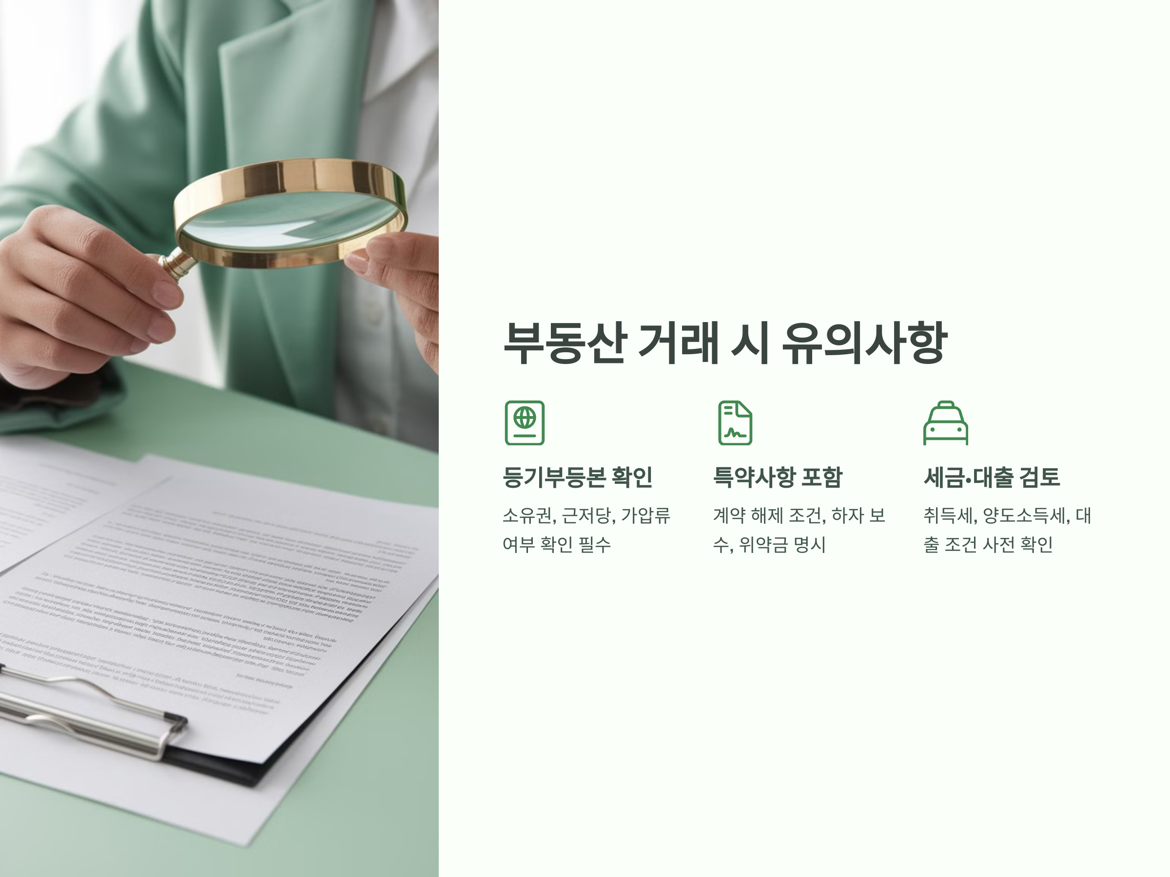 부동산 거래 시에는 다음과 같은 사항을 유의해야 합니다: