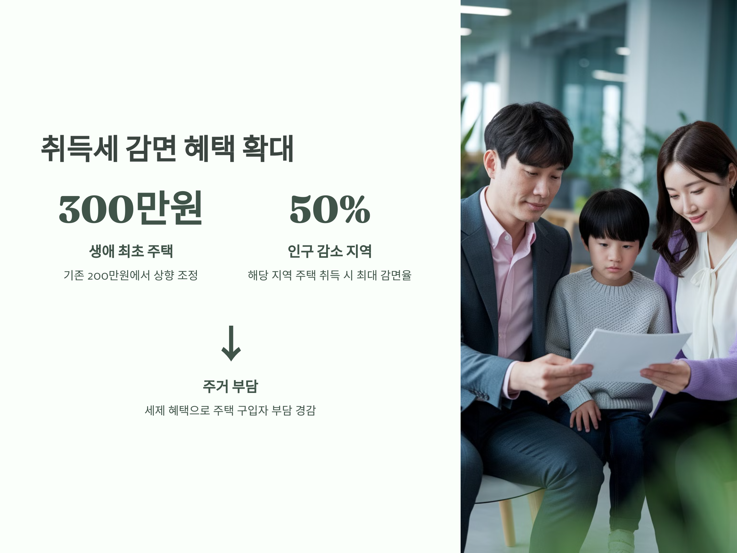 서민 주거 안정을 위해 생애 최초 주택 구입자에 대한 취득세 감면 한도가 기존 200만 원에서 300만 원으로 상향되었습니다. 또한, 인구 감소 지역 내 주택 취득 시 취득세를 최대 50%까지 감면받을 수 있게 되어, 해당 지역의 주거 활성화가 기대됩니다. 이러한 세제 혜택은 주택 구입자의 부담을 줄이고, 주거 안정을 도모하기 위한 정책입니다. citeturn0search6