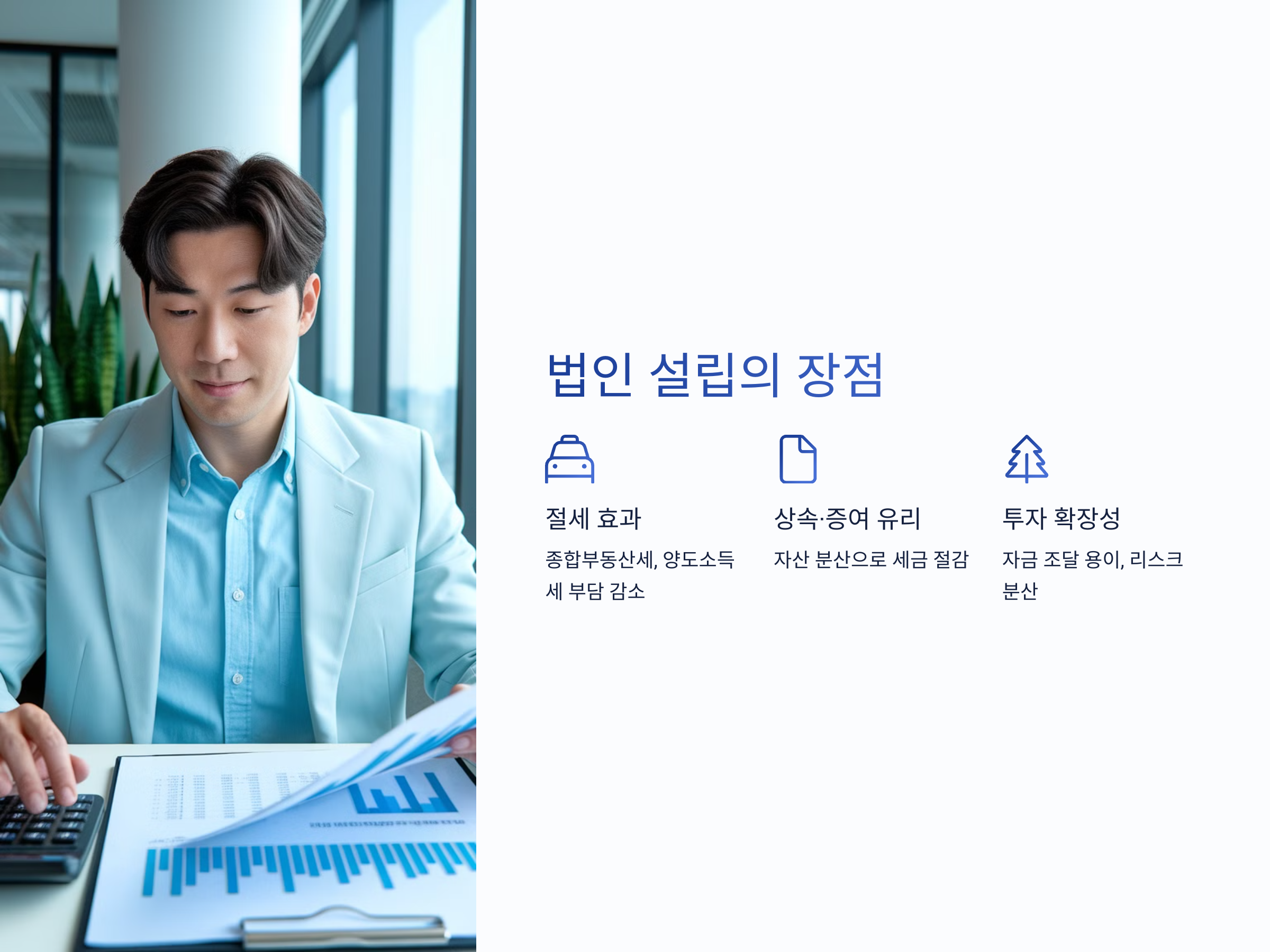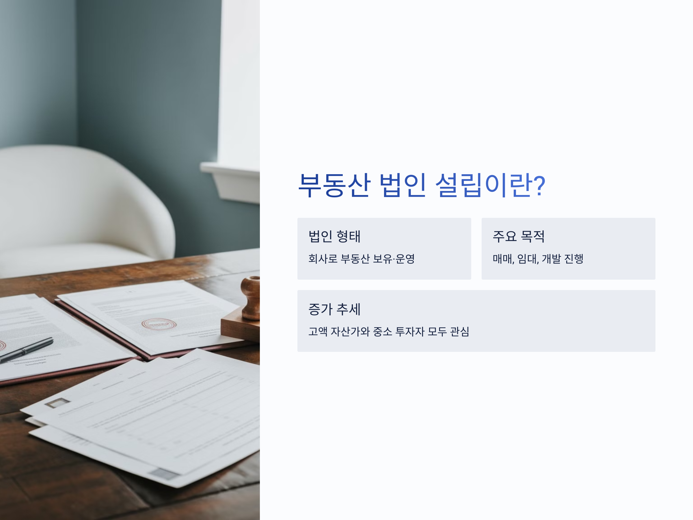법인을 설립하면 절세 효과, 투자 확장성, 상속 계획까지 여러 장점이 있지만, 반대로 추가 비용, 복잡한 회계, 관리 책임 등 단점도 함께 고려해야 합니다. 최근 트렌드로는 부동산 투자 회사를 창업해 수익형 부동산을 안정적으로 운영하는 사례가 많아졌으며, 2025년 이후에는 관련 세제 혜택 축소 가능성도 제기되고 있습니다. 이에 따라 지금이 부동산 법인 설립을 고민해볼 적기라는 분석도 나오고 있는데요. 오늘은 부동산 법인 설립의 장단점을 꼼꼼하게 살펴보고, 투자자라면 반드시 체크해야 할 포인트까지 알려드리겠습니다.