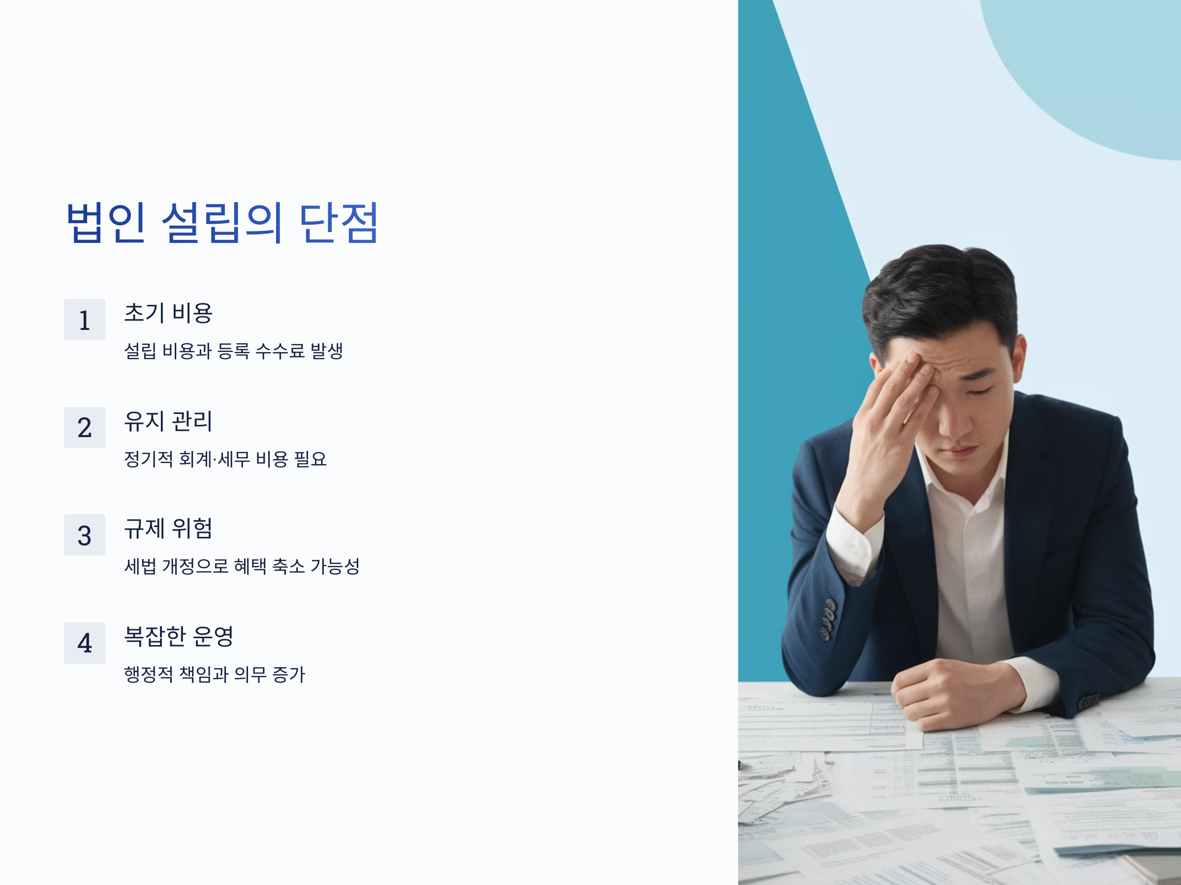 그러나 모든 일이 장점만 있는 것은 아니죠. 부동산 법인 설립에는 단점도 많습니다. 가장 큰 문제는 초기 설립 비용과 매년 발생하는 회계, 세무 비용입니다. 법인은 사업자 등록, 정기적인 회계 감사, 세무 신고 등을 필수로 해야 하며, 이를 위한 전문가 비용이 꾸준히 발생합니다.