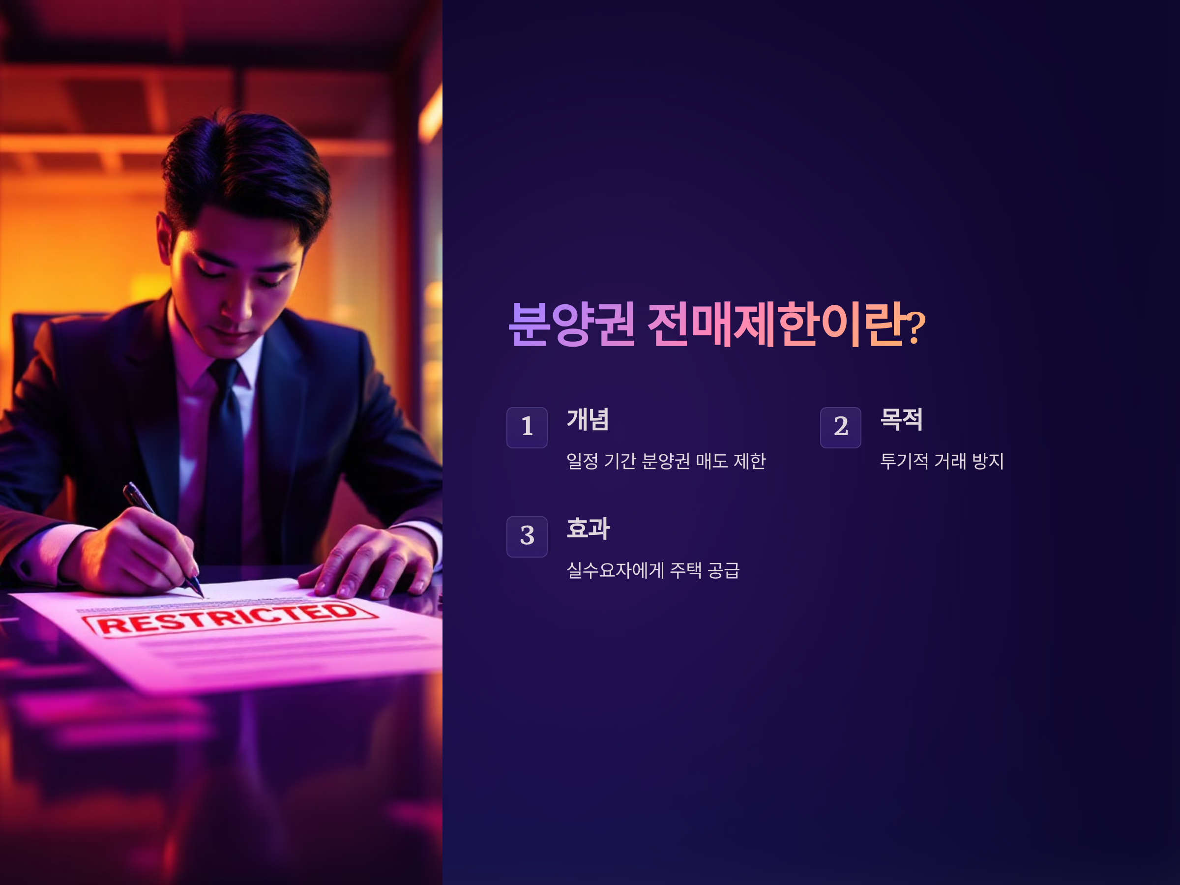 분양권 전매제한은 분양을 받은 사람이 일정 기간 동안 분양권을 제3자에게 매도하는 것을 제한하는 제도입니다. 이는 주로 투기적 목적의 거래를 막고, 분양권이 실수요자에게 돌아가게 하기 위한 법적 장치로 사용됩니다. 분양권 전매제한은 분양을 받은 자가 일정 기간 내에 매매나 전대를 통해 다른 사람에게 권리를 넘기는 것을 금지합니다.