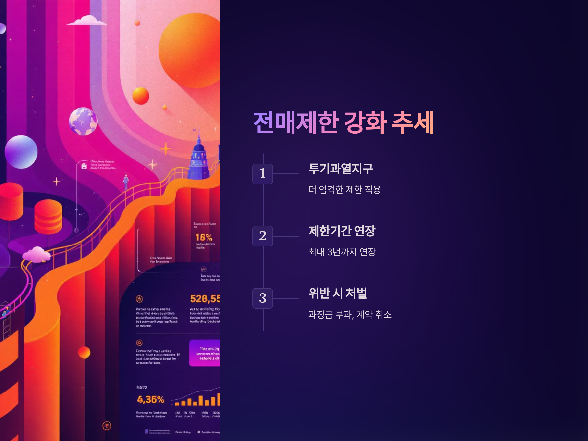 최근 몇 년간 정부는 분양권 전매제한 규제를 점차 강화하고 있습니다. 특히, 투기과열지구나 조정대상지역에서는 전매제한이 더 엄격하게 적용됩니다. 정부는 이러한 강화된 규제를 통해 과도한 투기를 차단하고, 실수요자에게 주택이 돌아갈 수 있도록 유도하고 있습니다.