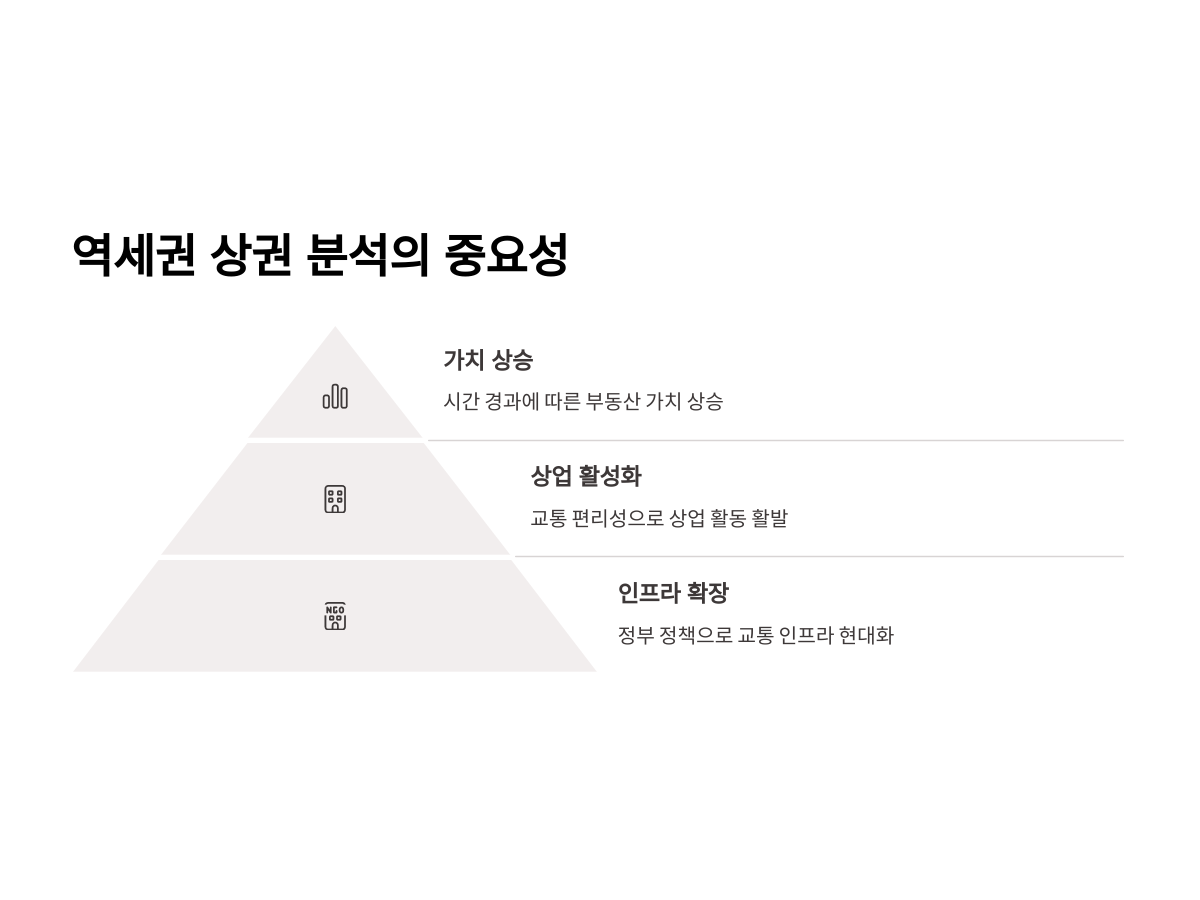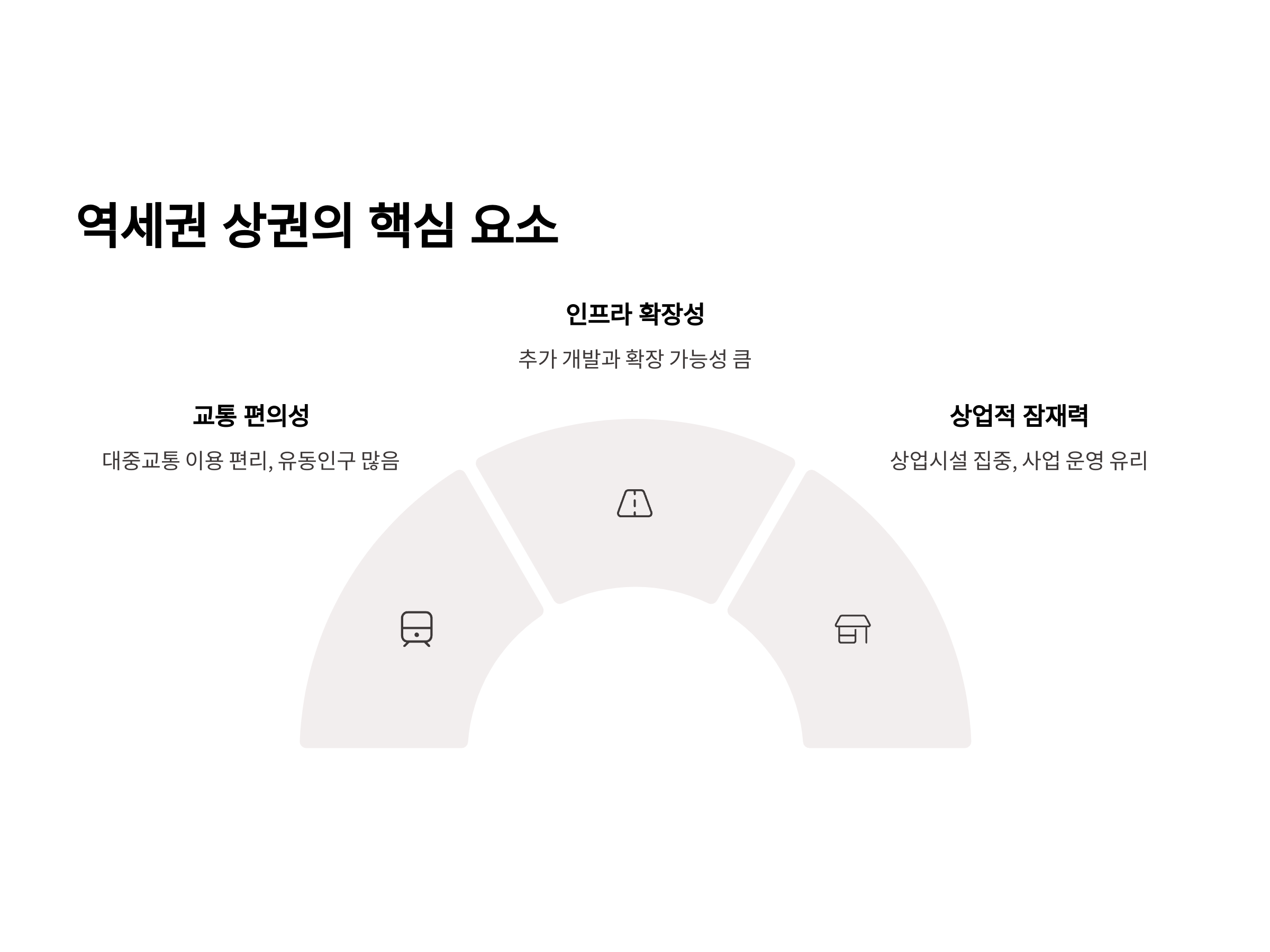 역세권 상권의 핵심 요소는 크게 세 가지로 나눌 수 있습니다. 첫째, 교통 편의성입니다. 사람들이 편리하게 대중교통을 이용할 수 있는 위치에 상업시설이 집중되기 때문에, 역세권 주변은 항상 사람들이 많이 오가는 지역입니다. 둘째, 인프라 확장성입니다. 역세권은 대개 교통 인프라가 발달한 지역이므로, 추가적인 개발과 확장 가능성이 크다는 장점이 있습니다. 셋째, 상업적 잠재력입니다. 역세권은 상업시설이 집중되는 경향이 있기 때문에, 사업 운영 측면에서도 매우 유리한 위치를 점하고 있습니다.