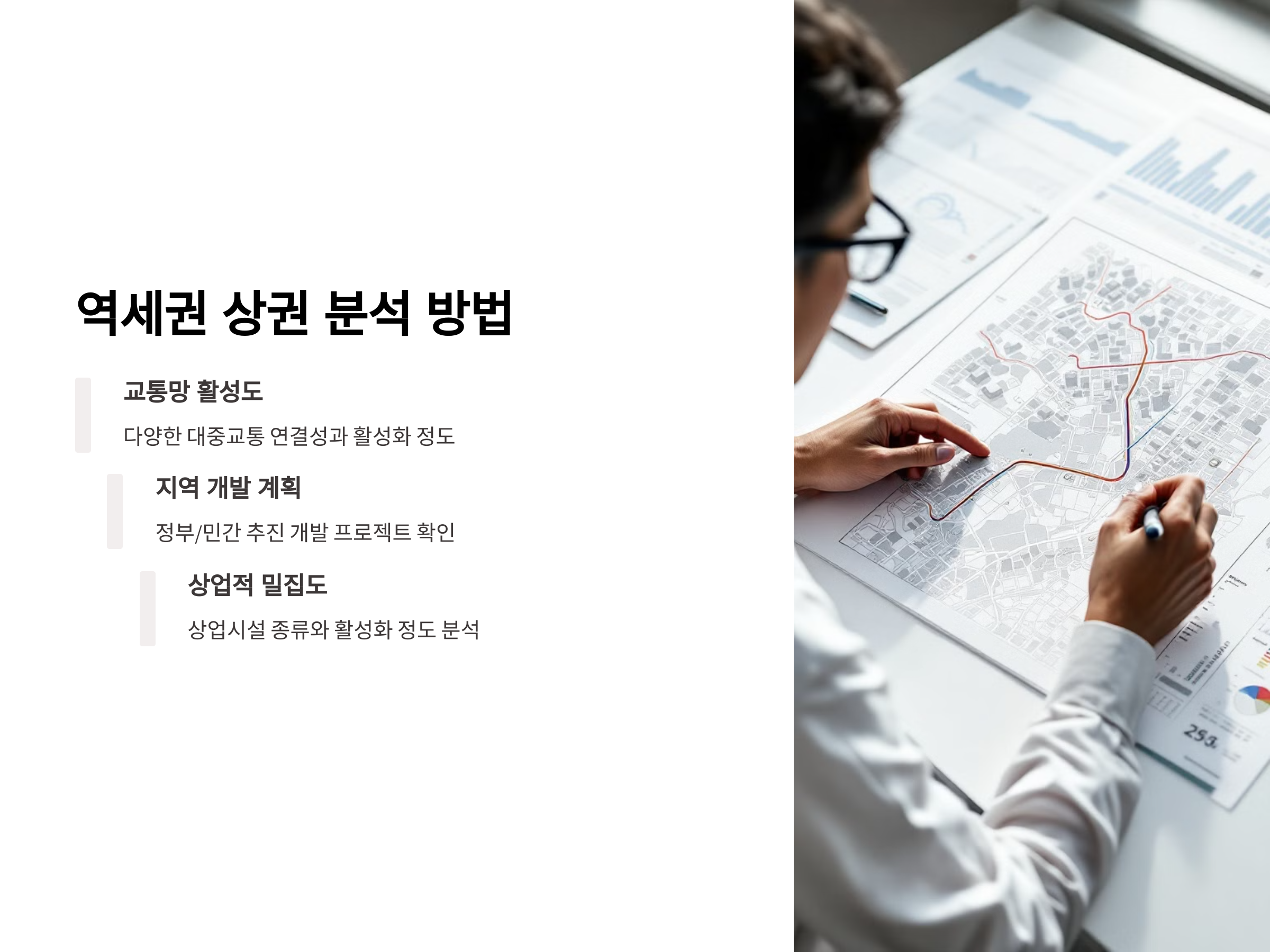 역세권 상권 분석을 하기 위해서는 몇 가지 중요한 사항을 고려해야 합니다. 첫째, 교통망의 활성도입니다. 해당 역세권이 얼마나 다양한 대중교통 수단과 연결되어 있는지, 그리고 그 교통망이 얼마나 활성화되어 있는지 파악하는 것이 중요합니다. 둘째, 지역 개발 계획입니다. 해당 지역이 향후 어떤 개발 계획을 가지고 있는지, 정부나 민간이 추진하는 개발 프로젝트가 있는지 확인하는 것이 중요합니다. 셋째, 상업적 밀집도입니다. 역세권 주변에 어떤 상업시설들이 밀집해 있는지, 그리고 그 상업시설들이 얼마나 활성화되어 있는지 분석해야 합니다.