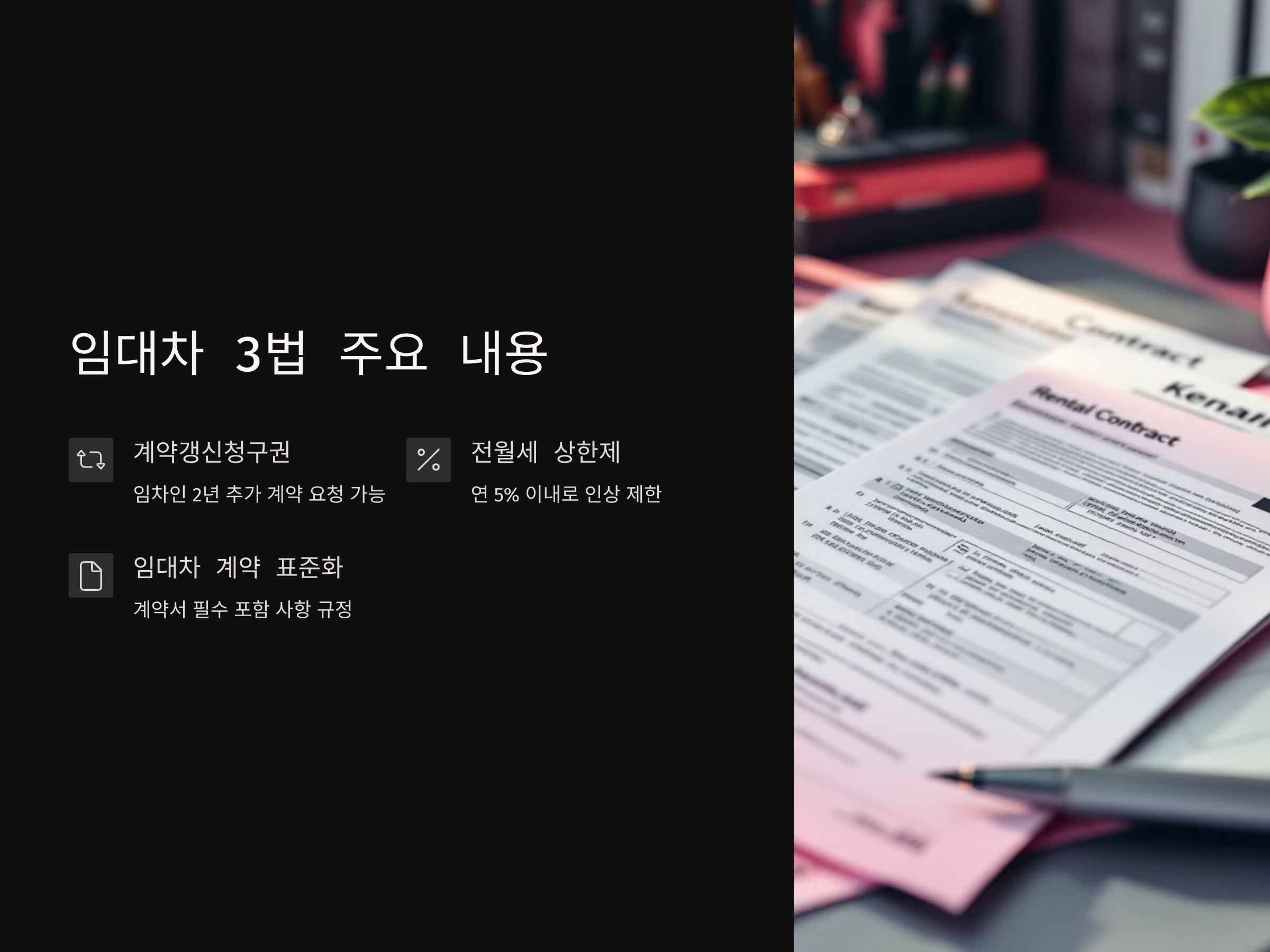 임대차 3법 개정의 핵심은 계약갱신청구권, 전월세 상한제, 임대차 계약 표준화입니다. 각각의 법이 주는 의미와 목적을 차례대로 살펴보겠습니다.