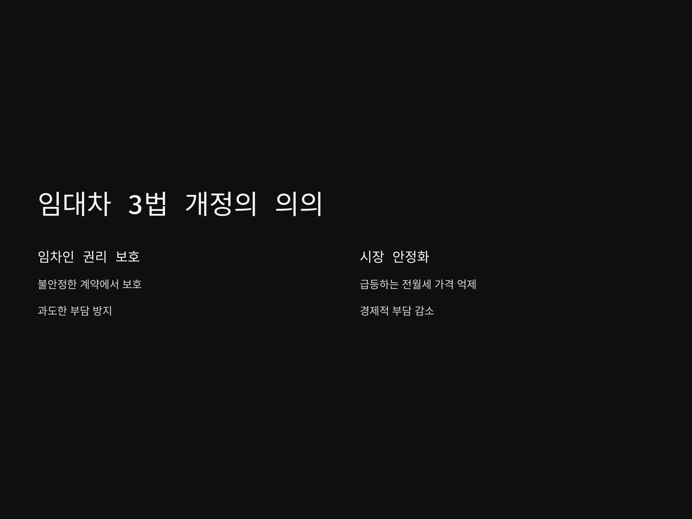부동산 임대차 3법 개정의 의의는 주로 두 가지로 요약할 수 있습니다. 첫째는 임차인의 권리 보호, 둘째는 시장 안정입니다.