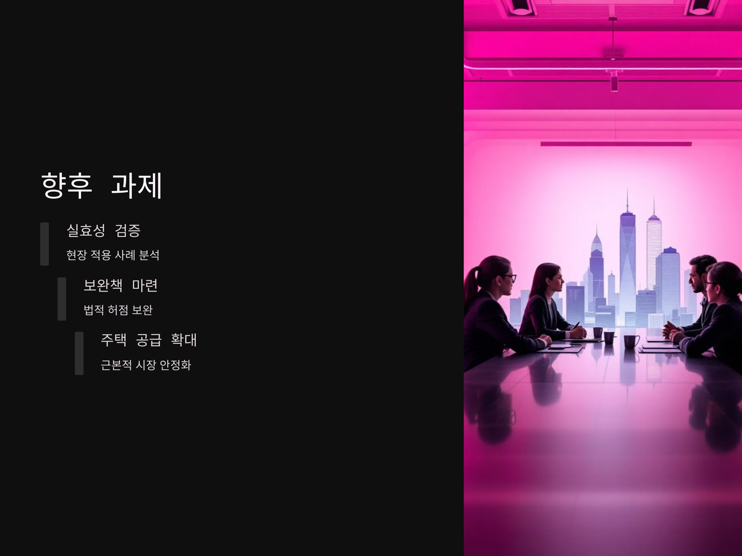 앞으로 부동산 임대차 3법의 실효성을 높이기 위해서는 임대차 법 개정 외에도 주택 공급 확대와 같은 근본적인 대책이 필요합니다. 정부는 주택 공급을 늘리고, 임대차 시장의 안정성을 높이기 위한 다양한 정책을 추진하고 있으므로, 향후 몇 년간 시장을 면밀히 지켜볼 필요가 있습니다. 또한, 임대차 3법이 현실적으로 임차인에게 얼마나 큰 이익을 제공할 수 있는지, 법적 보호의 한계를 어떻게 극복할 수 있을지에 대한 고민이 필요할 것입니다.