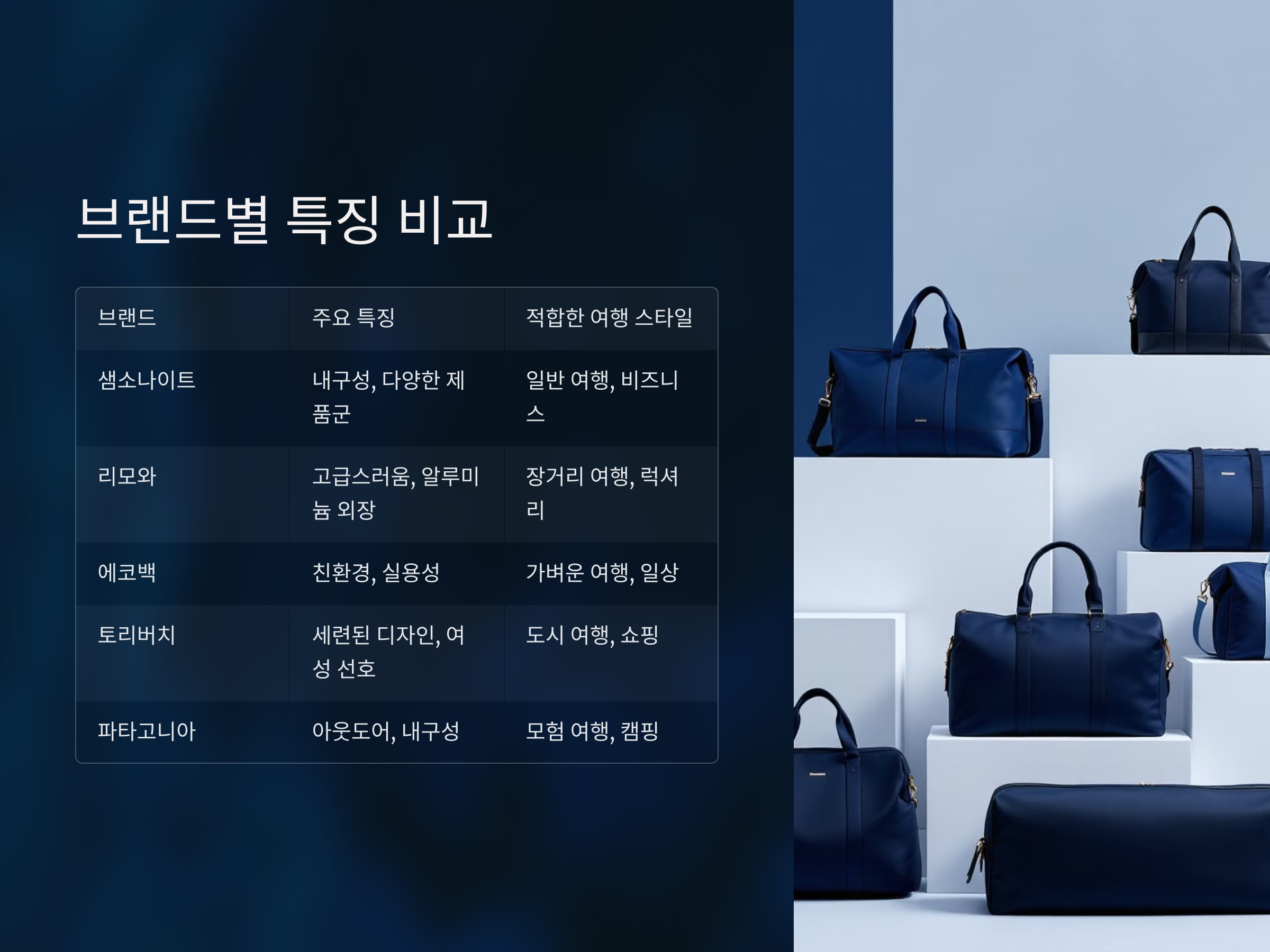 이번에 소개한 브랜드들 중에서 각자의 여행 스타일에 맞는 가방을 선택하고, 여행을 더 편리하고 즐겁게 만들어보세요.