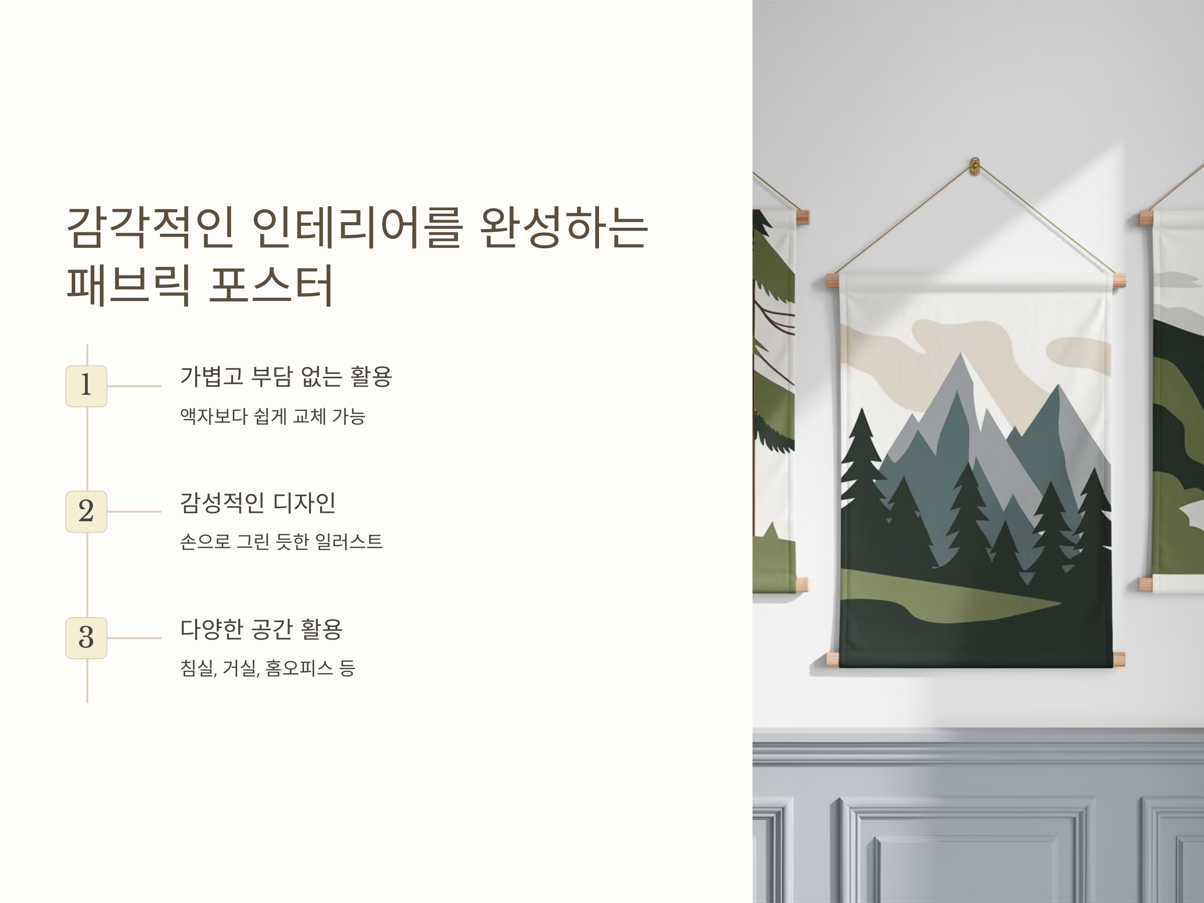패브릭 포스터는 쉽게 교체할 수 있으면서도 공간에 개성을 더해줄 수 있는 아이템입니다. 액자보다 가볍고 부담 없이 사용할 수 있으며, 북유럽 스타일의 감각적인 디자인이 돋보이는 제품들이 많습니다.