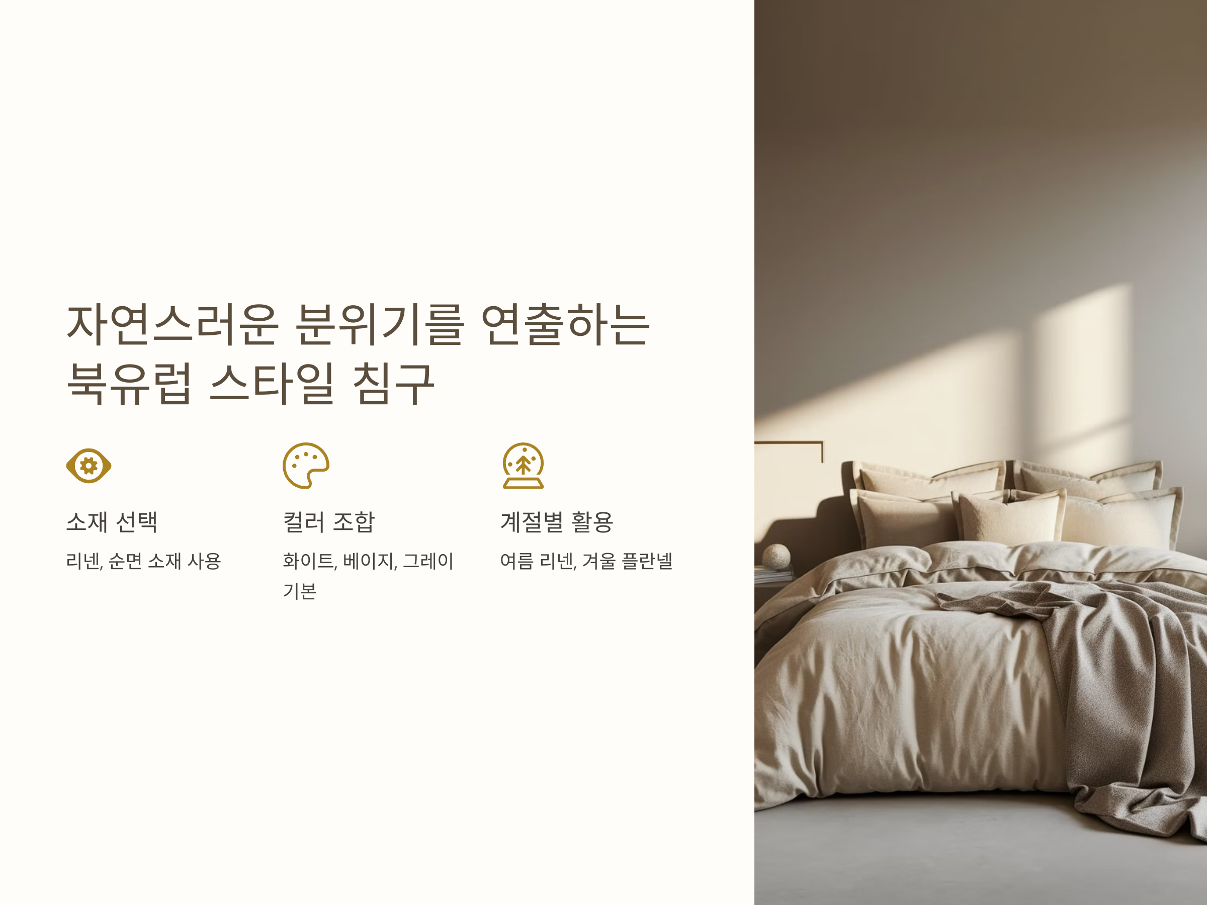 침구는 하루 중 가장 많은 시간을 보내는 공간인 만큼 편안함과 스타일을 동시에 고려해야 합니다. 북유럽 스타일 침구는 리넨이나 순면 소재를 많이 사용하며, 차분한 톤의 컬러와 자연스러운 텍스처가 특징입니다.