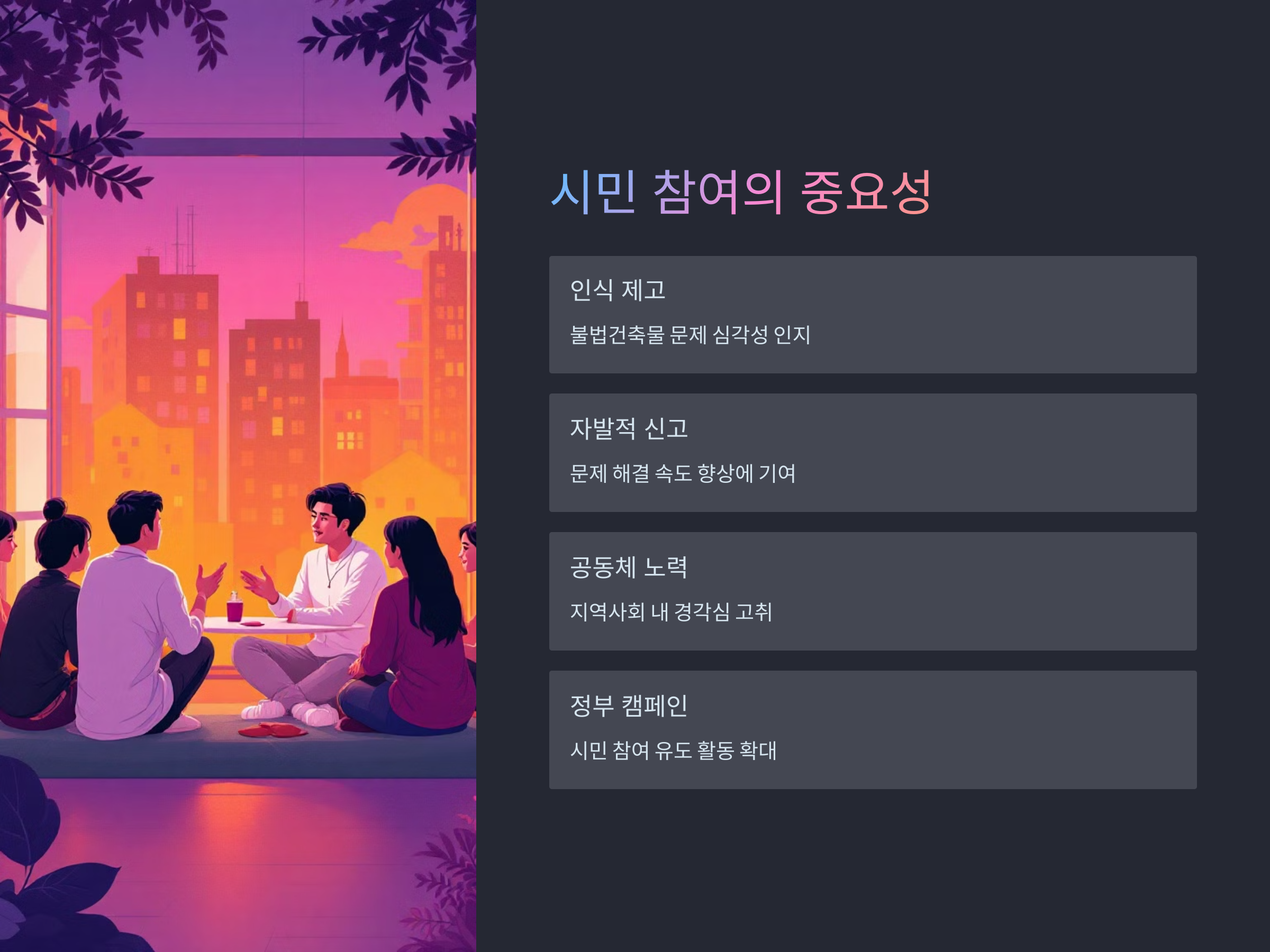 불법건축물 문제 해결에는 정부의 노력뿐만 아니라 시민들의 적극적인 참여가 중요합니다. 시민들이 불법건축물 문제에 대한 인식을 높이고, 자발적으로 관련 신고를 하는 등의 활동이 이루어져야만 문제 해결의 속도가 빨라질 수 있습니다. 또한, 지역사회 내에서 불법건축물에 대한 경각심을 일깨우고, 이를 해결하기 위한 공동체적 노력이 필요합니다.