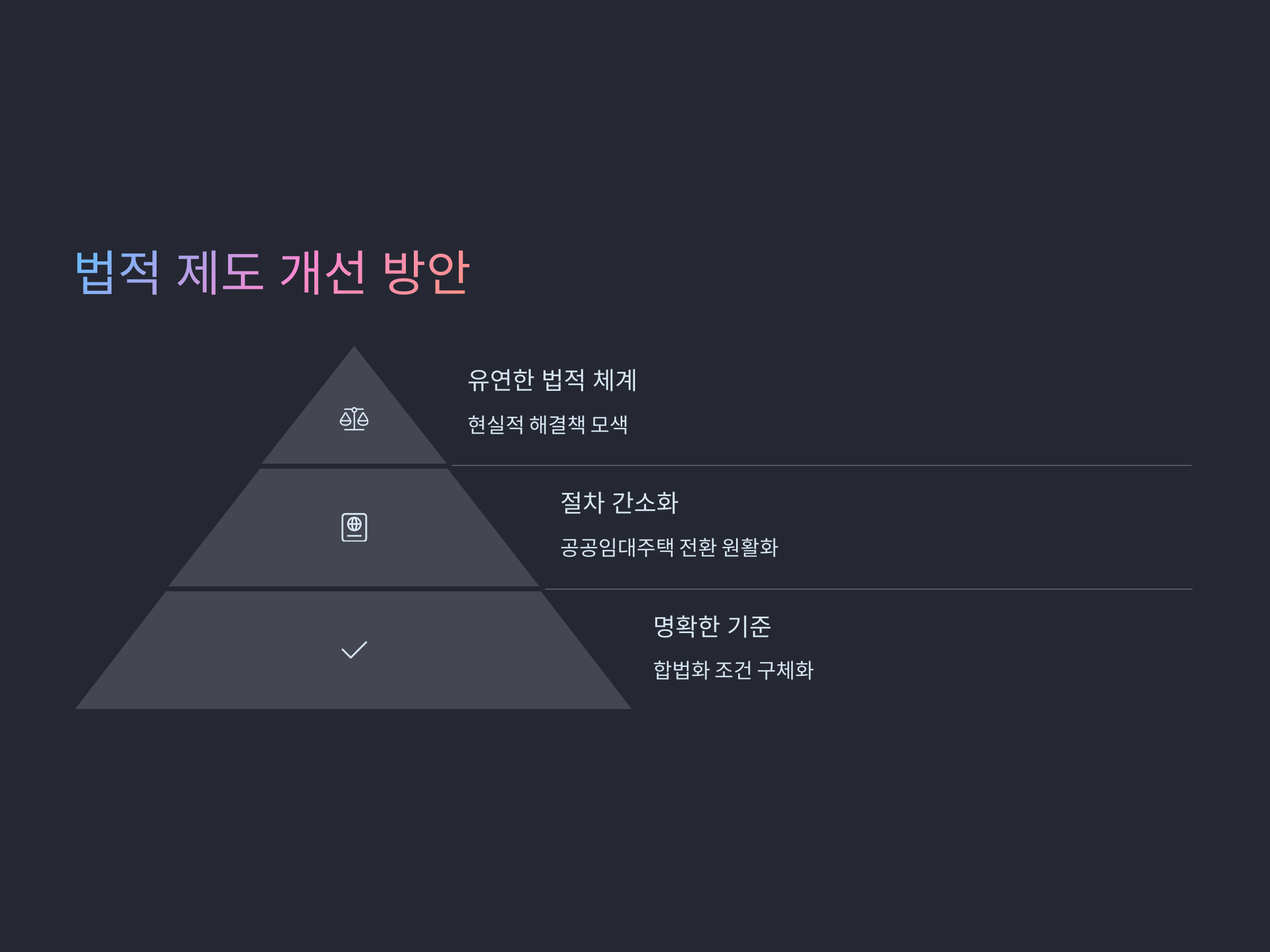 법적 제도의 개선을 위해서는 전문가들의 의견을 반영하여, 불법건축물에 대한 법적 제재와 규제를 현실에 맞게 조정하는 것이 필요합니다. 예를 들어, 공공임대주택으로의 전환을 보다 원활하게 하기 위한 법적 절차의 간소화가 이루어져야 하며, 불법건축물이 합법화될 수 있는 기준을 명확히 정하는 것이 중요합니다.