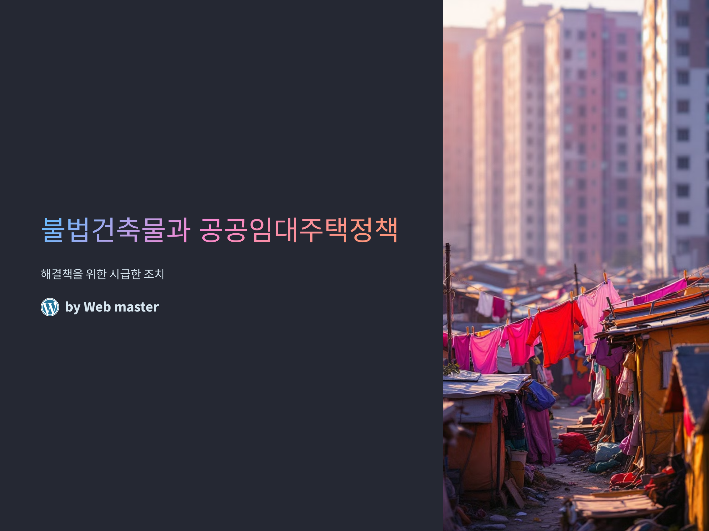 불법건축물의 문제는 단순히 불법적인 행위로만 볼 수 없으며, 사회적으로 심각한 영향을 미칩니다. 특히 공공임대주택과 관련해서는, 불법건축물이 공공임대주택 공급의 주요 방해 요소로 작용할 수 있습니다. 이로 인해 많은 사람들이 안전하고 합법적인 거주지에서 살지 못하고, 불법건축물에서 생활할 수밖에 없는 상황에 놓이게 됩니다.