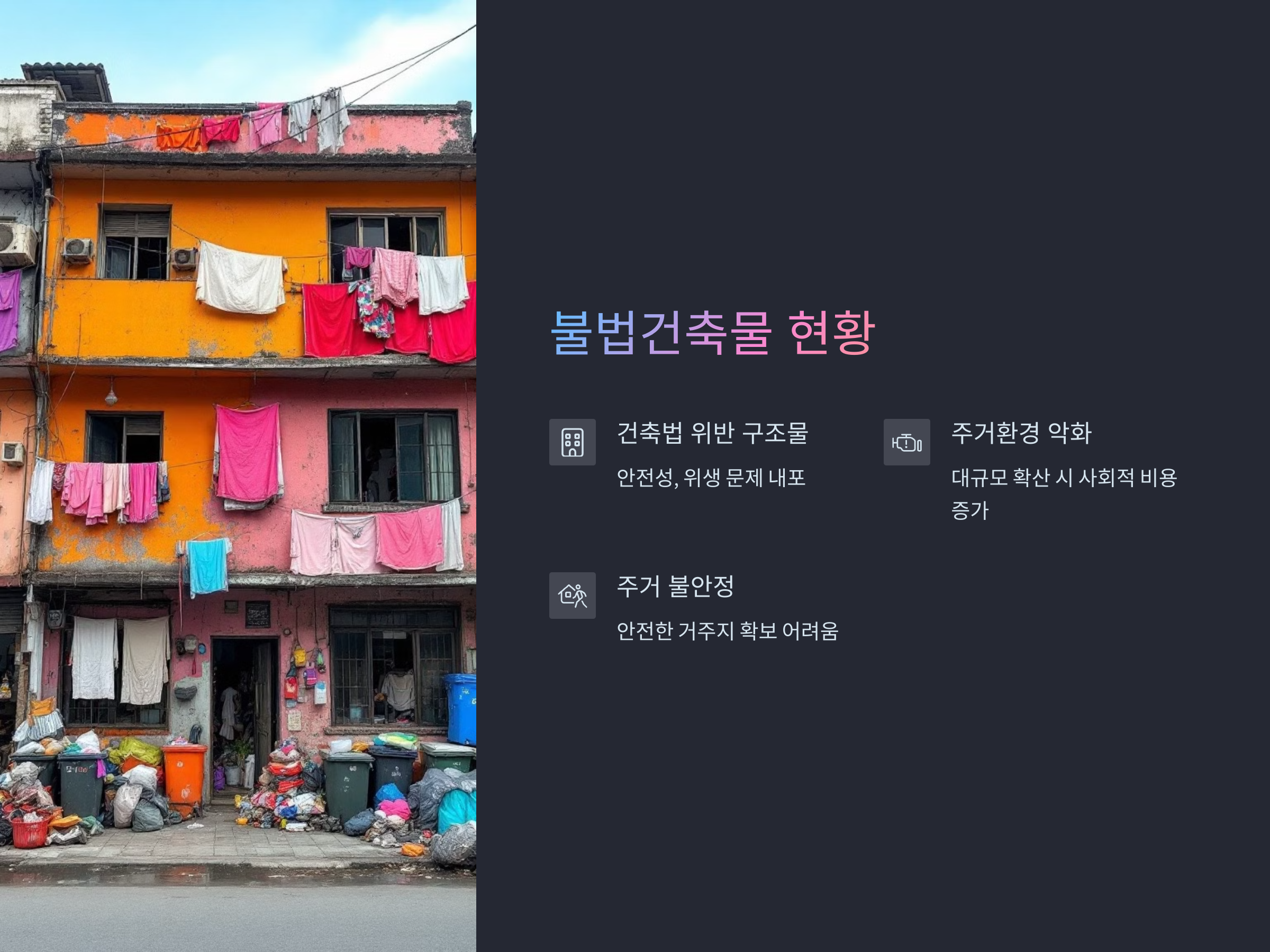 불법건축물은 건축법과 관련 법률을 위반하여 지어진 건축물로, 일반적으로 안전성, 위생 문제, 불법적인 세입자 보호 등 여러 가지 문제를 내포하고 있습니다. 특히, 불법건축물이 대규모로 확산되면 주거환경이 열악해지고, 사회적 비용이 증가하는 문제를 일으킬 수 있습니다. 이에 따라 정부는 불법건축물을 해결하기 위해 다양한 대책을 마련하고 있지만, 여전히 해결되지 않은 부분이 많습니다.