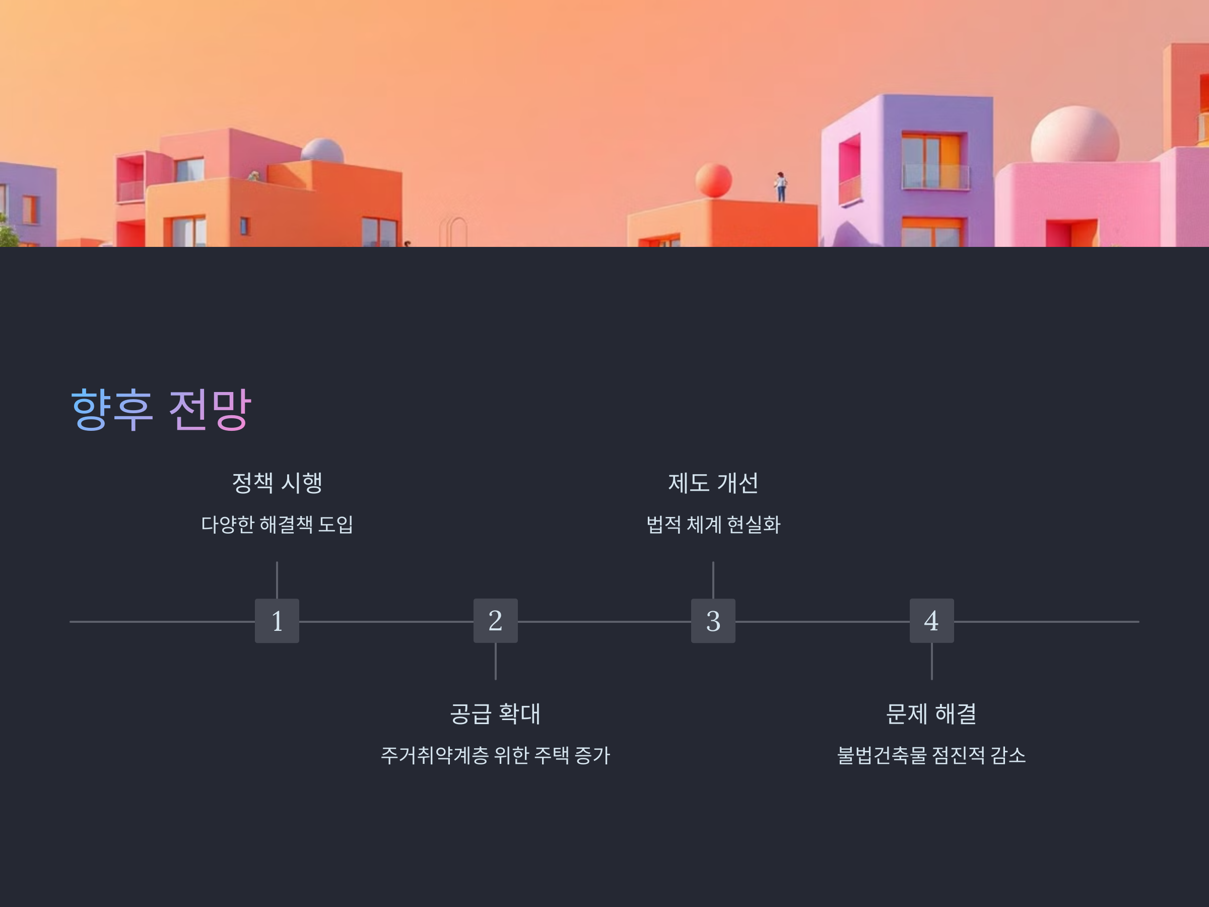 향후 불법건축물 문제 해결을 위한 다양한 정책이 시행될 것으로 예상되며, 이를 통해 주거 취약 계층을 위한 공공임대주택의 공급이 더 원활해질 것입니다. 또한, 법적 제도의 개선과 시민들의 참여가 함께 이루어질 때, 불법건축물 문제는 점차 해결될 수 있을 것입니다.
