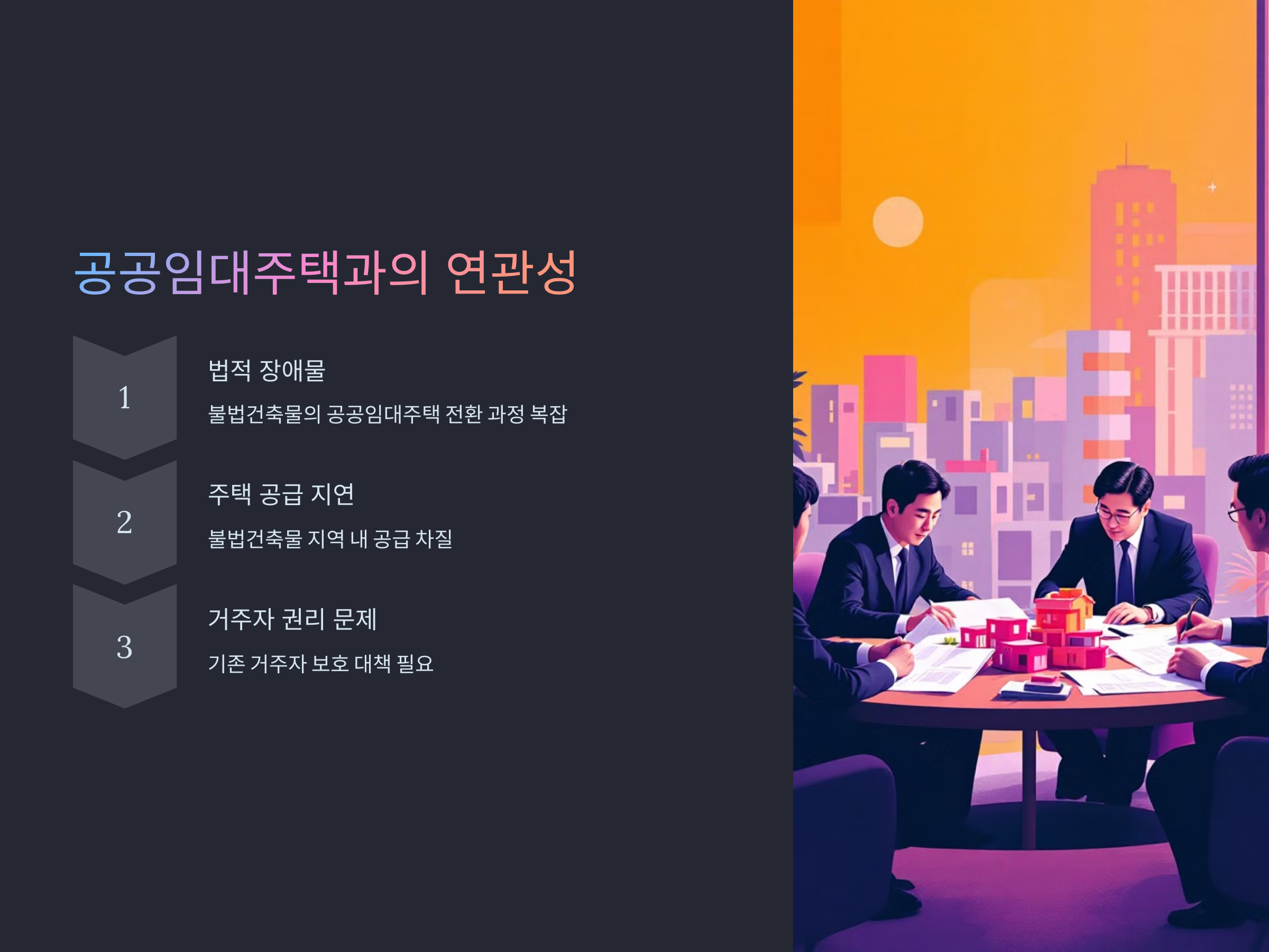 불법건축물이 공공임대주택 정책에 미치는 영향은 매우 큽니다. 한국 정부는 지속적으로 공공임대주택 공급을 늘려가고 있지만, 불법건축물 문제로 인해 많은 주택이 법적 절차를 따라야만 보급될 수 있습니다. 특히, 불법건축물 중 일부는 공공임대주택으로 전환될 수 있지만, 이 과정에서의 법적 장애물들이 여전히 해결되지 않은 상태입니다.