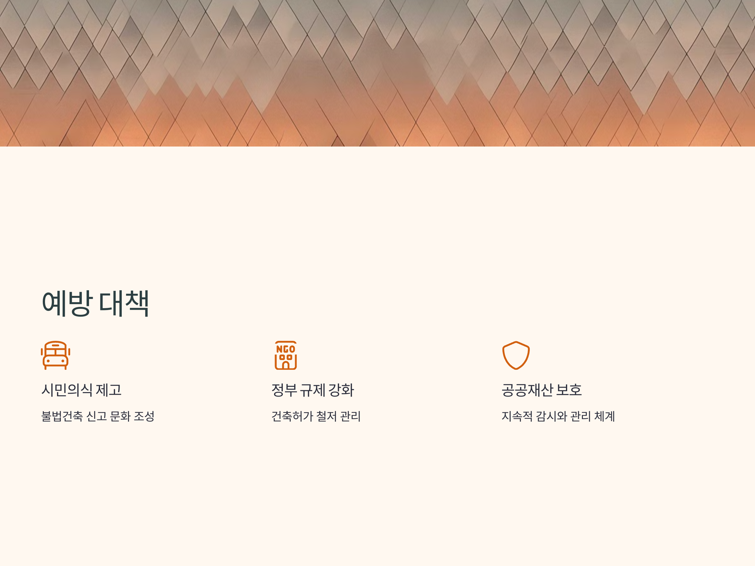 정부는 불법건축물이 발생하지 않도록 규제를 강화해야 합니다. 건축허가를 철저히 관리하고, 불법건축물이 발생할 경우 즉각적인 대응이 이루어질 수 있도록 시스템을 개선해야 합니다.