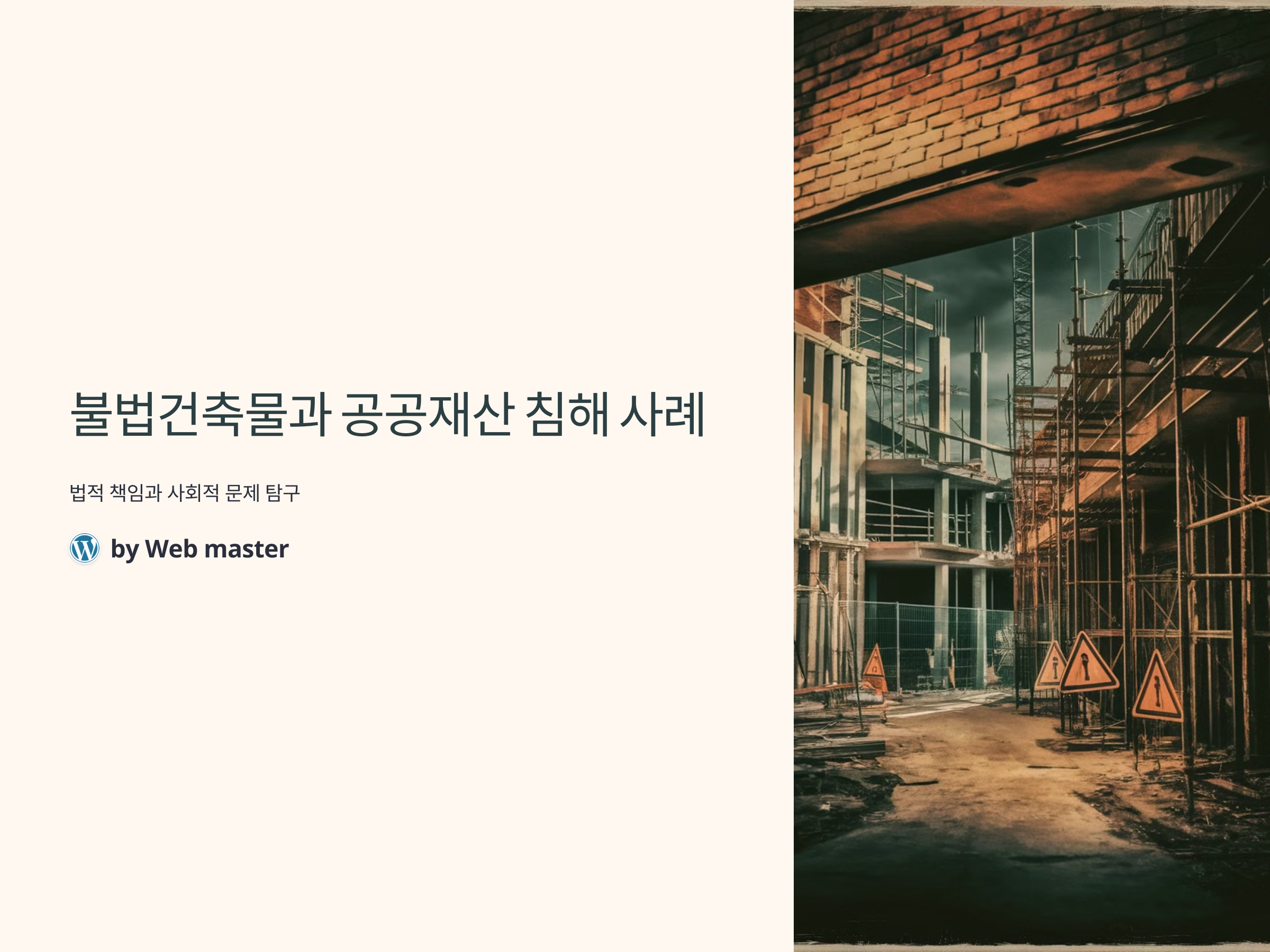 불법건축물은 단순한 법적 위반이 아니라, 공공재산 침해와 사회적 혼란을 초래할 수 있는 중요한 문제입니다. 이를 예방하고 해결하기 위해서는 정부와 시민들의 적극적인 협력이 필요합니다. 건축법을 준수하고, 공공재산을 보호하는 것은 모두의 책임임을 명심해야 합니다.