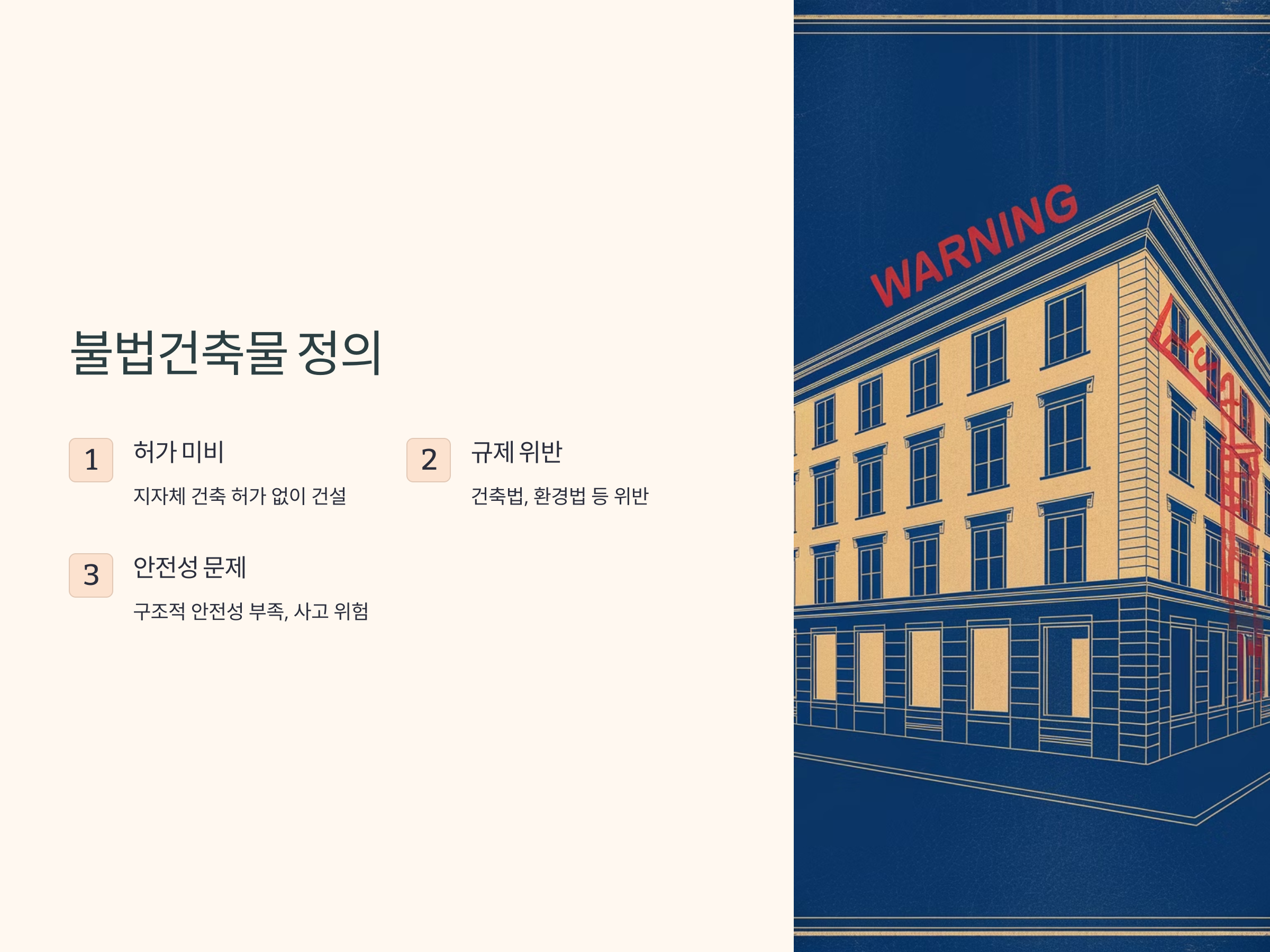 - 허가 미비: 건축물은 반드시 지방자치단체로부터 건축 허가를 받아야 합니다. 이를 무시하고 건설된 경우, 불법건축물에 해당합니다.